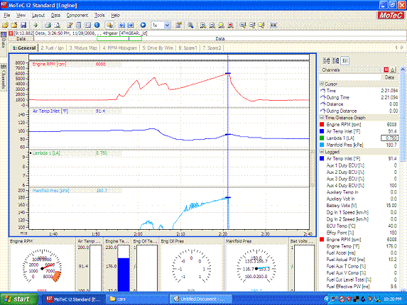 Here is a 4th gear pull from about 3000 to 6000 RPMs. I have a 9psi wastegate spring, but you can see, in 4th, it gets up to about 12 psi. The car is tune for that range, so it isn't a big deal... The turbo is just letting me know it wants to be opened up some more!!