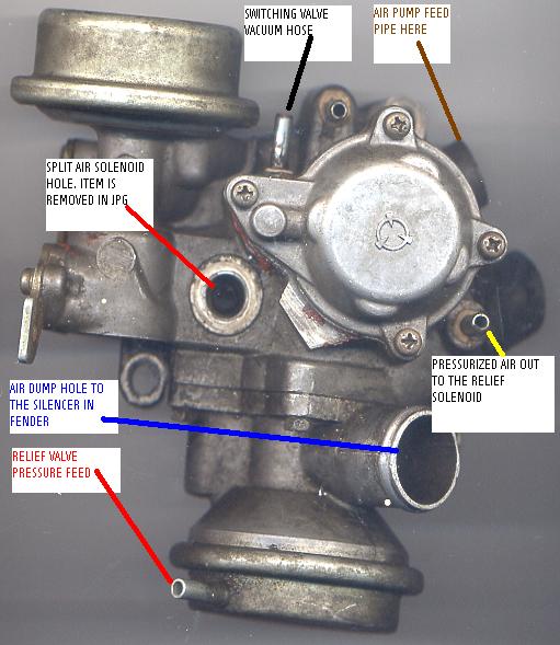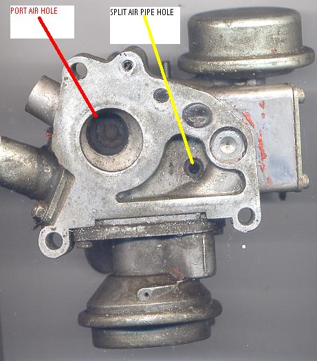 I'm adding a jpg of the acv. On the picture I point to the hole that feeds the Split Air Pipe and the hole/poppet that feeds the exaust ports. The Port Air hole matches the checkvalve that is installed on the manifold.