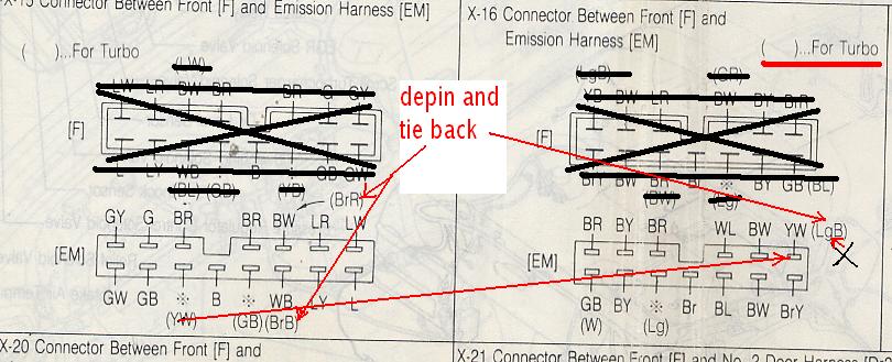Here are three jpg of the plugs. Remember, the wires with ( X) around are the wires in a turbo harness.