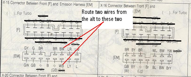 YOu have no alt wires from the back of the alt, but can run two wires from there to the X-15 plug and mate them with the B/W and W/B wires shown in the Front harness of the n/a front harness (they'd be put in the mating half of the emissions harness to mate).