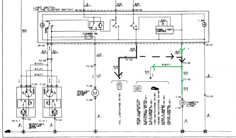 Don't read the FAQ! But check for voltage on the Red/Green wire that comes from the headlight switch harness. This can be done at that particular harness or you could locate connector FC-02 which is located down by the driver's side kick panel. There you will find a couple of blue connectors of similar size but FC-02 "is not" the one which has a number of blue coded wires so the other connector is FC-02. Find this connector which is the joining of two plugs and both of them contain the R/G wire. With the headlight switch **** turned to the illuminate the dash lights position check for voltage on this R/G wire for it should exist. If it is not present then an additional wire could be used to help illuminate the troubled lights but you will lose the ability to change the brightness of the dash lights.