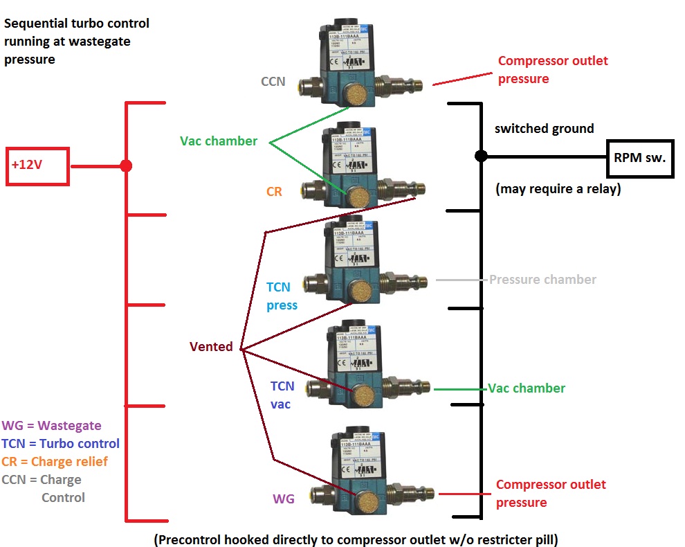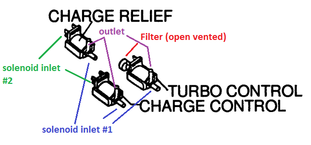 In this case let's assume you are running at the spring pressure of 7-8psi. The OEM FD solenoids are known to be problematic, but you should be able to use aftermarket 3 port solenoids, same as the Haltech/AEM boost control soleniod, to control the twins (viton check valves are an upgrade as well).