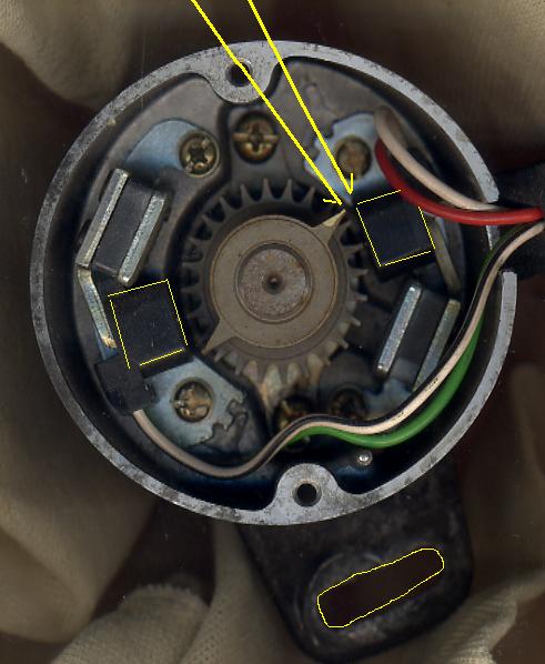 Hold that positon and now look into the top of the CAS with cover removed. Look at the two top teeth on the rotor and notice how those two teeth are just opposite the corner of the black reluctors.
