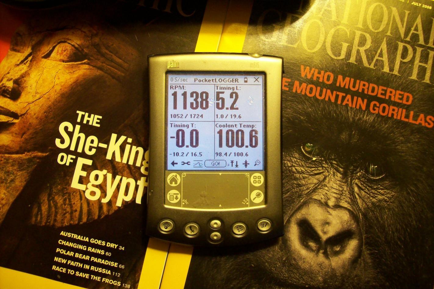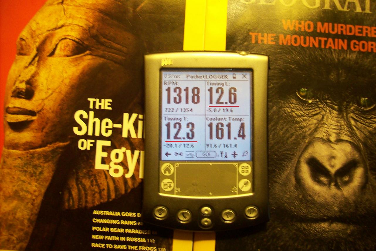 Here is why the engine needs to be up to temp before timing it. The engine temp is shown on the Palm and the lead and tail timing is show. Those are ATDC figures, not the stock idle of -5 and -20T at full temp idling.