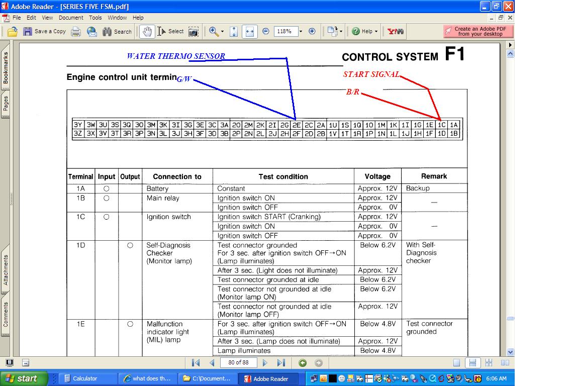 2E for the water thermo sensor. Should be 2-3vddc engine cold. Engine hot a half volt to 0.40vdc. Green/White wire.