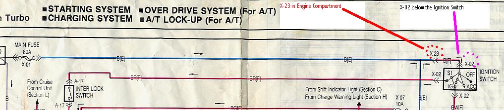 Three jpg's attached. The first shows the run of wiring from the engine fuse box to the ignition switch. The item called X-23 is the single connector in the engine bay near the fuse box. Note now things are not to scale in this diagram.