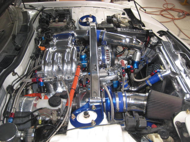 Decided to rebuild the motor this summer (needed more POWAH ) and also decided to get rid of ALL the blue hoses and couplers. I felt it had run it's course so I went back to the tried and true Black hoses...ceramic coated LIM,UIM,Alternator and water pump housing. I also painted the strut bar ends in Black.