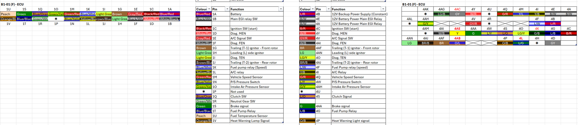 2. I wasn't aware of the differences. The car has the S7 (V4) coils I believe, I've also compared all of the wiring / connector pinouts related to the ECU and common (X) connectors in the 'ECU area'. Just a small snapshot of my comparison in Excel of one of the ECU connectors that shows the igniter signal pins and I do believe them to be pinned correctly to the new ECU.