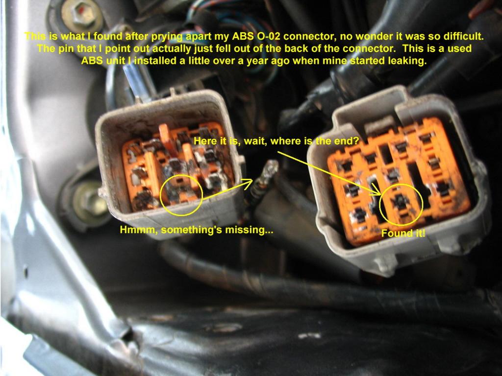 That's cute isn't it? Somehow I got moisture in there I guess and it cause the corrosion which ate away that 12v power pin in the connector for part of the ABS. After finding this I pulled both offending pins out of their respective connectors and routed them external to it, and viola! ABS works like a champ again. Just FYI for all you rotorheads out there, I guess these cars are getting old