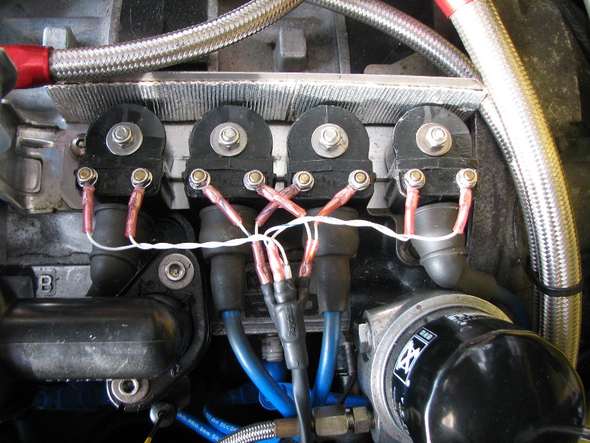 I am running all FOUR of my Jacobs C4 coils on a alum plate ,polished of course , that is bolted to a threaded stock hole in the finder .It is below the polished 929 brake master cylinder . The trailing coils are on the top of the plate with the leading coils on the botton of the plate .The spark plug wires are in line with each coil and spark plug ,no wires crossing each other .The longest wire is about seven inches long .The coils are seen from the top and block the plugs from the top .I change plug from the bottom . I am beta testing ing amps for AEM ,that is why I can run four coils .The amp in there now is doing well after more than a years use .