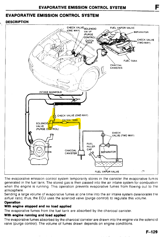Yup, same as mine except I'm rocking a 13B. What I'm doing is I added a purge solenoid valve, and one of Dale's Viton check valves, plumbing it exactly like it is in the FSM diagram, but without that small OEM catch tank (just running hose). For control of the solenoid, I'm assigning the solenoid to one of the spare outputs on my Link G4+ ECU that can do full PWM control, similar to how one would control a boost solenoid. A simple on/off type control might be sufficient here, but I wanted to replicate the OEM control strategy as much as possible. Basically the plan is to have the purge happening (i.e., solenoid fully open at high duty cycle) during low-to-moderate load cruise conditions only, between about 1700 ~ 4000 RPMs, and closed everywhere else. You don't want purge happening during idle, overrun fuel cut, under boost or high load vacuum conditions. More detail on what I did mechanically is in my build thread here https://www.rx7club.com/build-thread.../#post12580556 and in this thread, starting on post #40 https://www.rx7club.com/3rd-generati...ssion-1152638/