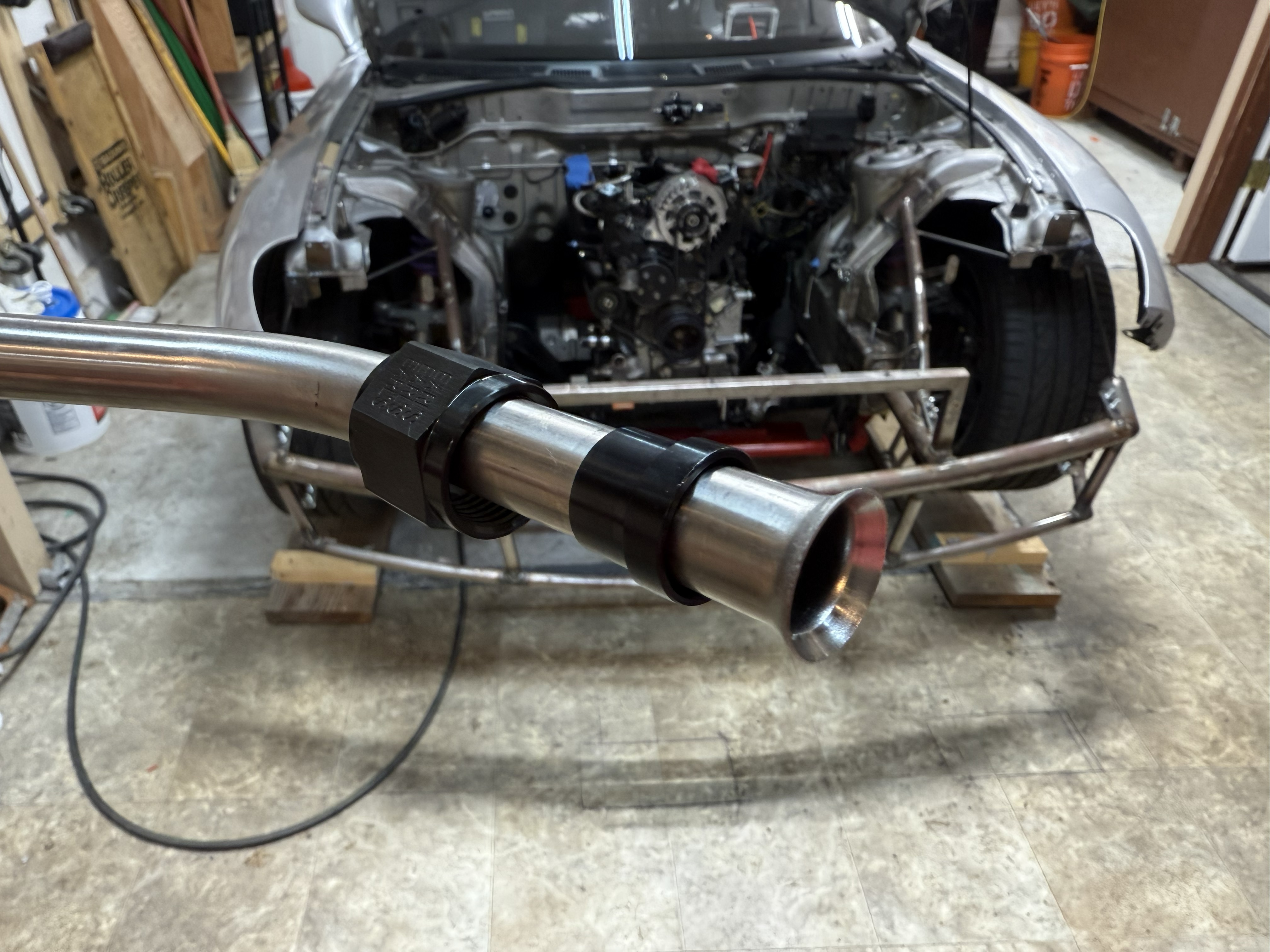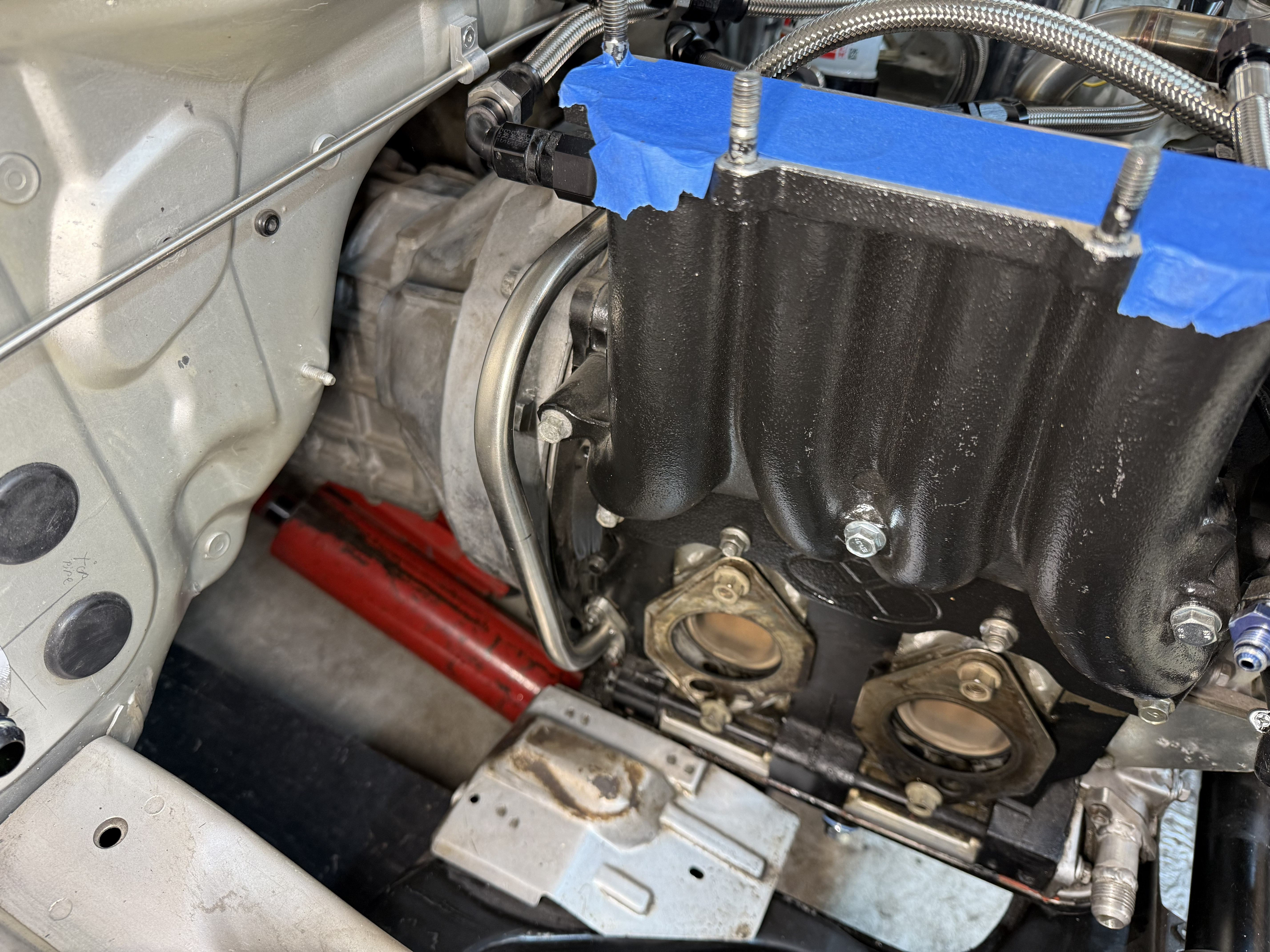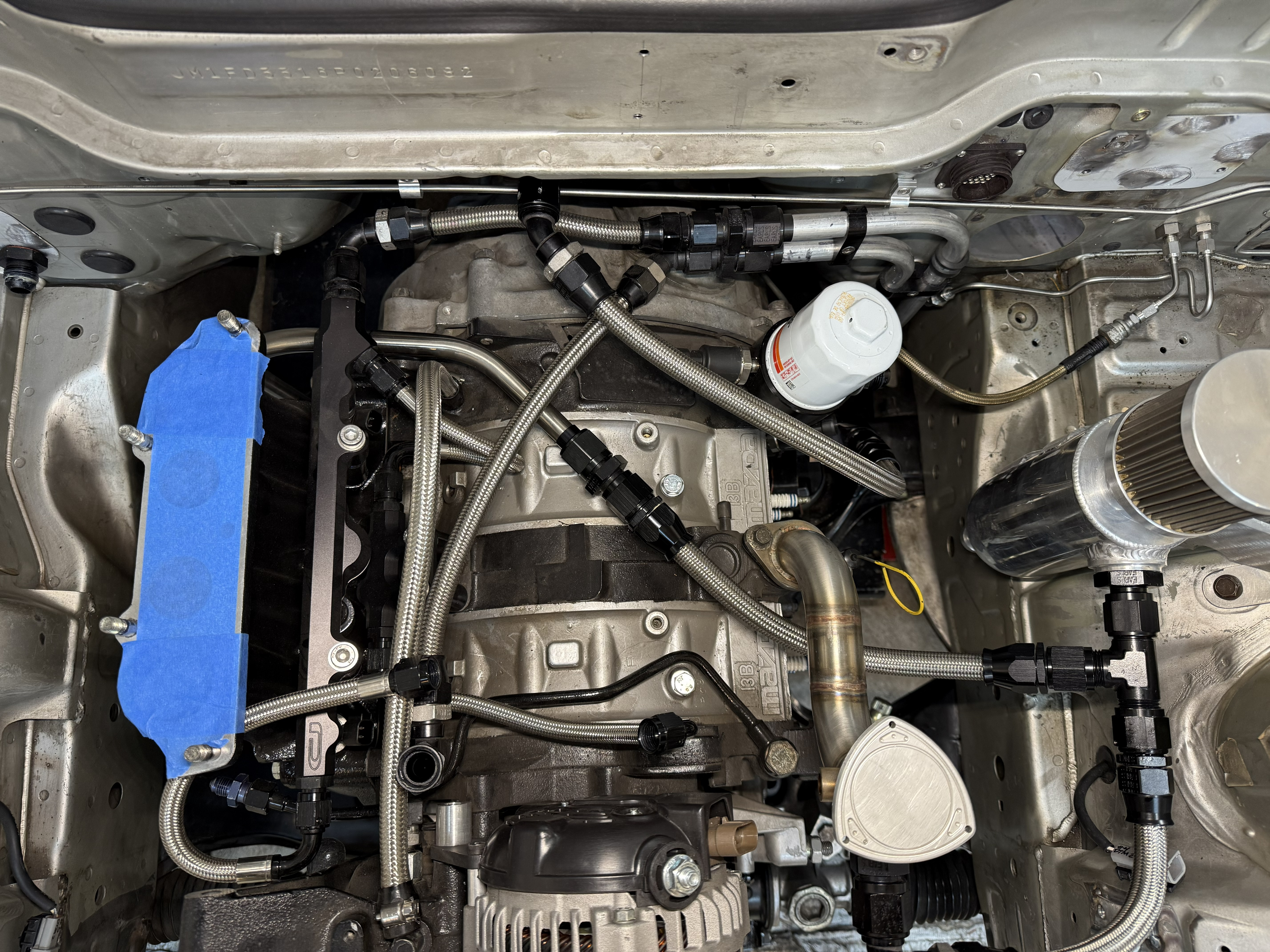 Thought I would share the crankcase ventilation setup I added a while back to my FD. I initially installed the IRP baffled filler neck and a universal ventilated catch can from Summit. During testing I was getting more oil in the catch can than I wanted. I researched a bit and found some other forum members tapping into the unused rear turbo oil drain port to allow the crankcase to be vented from both sides of the block. My setup is a little different than other installs and I used a hard line for the leader off the oil return port. I didn't want to use a flexible hose so close to the turbo and manifold. I just got the car back on the road so I have not had a chance to verify the performance. I will post updates if I have any issues or modify anything.