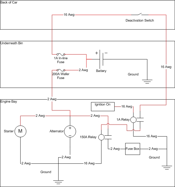 Here's a wiring diagram I created to explain what I'm talking about. I left off the physical requirements (bolts, battery box etc) as well as the stereo system stuff I would also have connected. I'll include those in a revised diagram if there's interest.