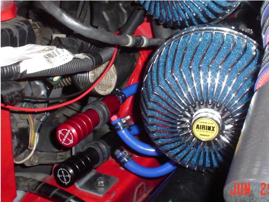 Damian used two ball & spring type controllers, one on the wastegate control, and one on the pre-control actuator, both with the lines to the stock control solenoids blocked.