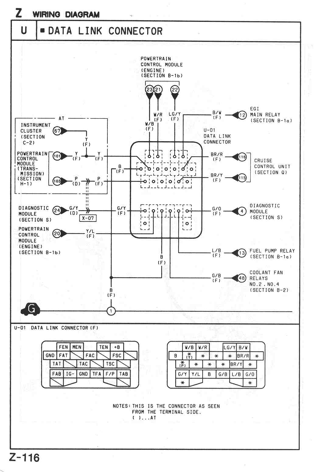 I have attached a copy of page Z-116 of my 1994 RX-7 Workshop Manual. It is both an illustration of, and a guide to, the Data Link Connector under the hood. The terminal locations are shown in the lower portion of the page, and their functions in the upper portion.