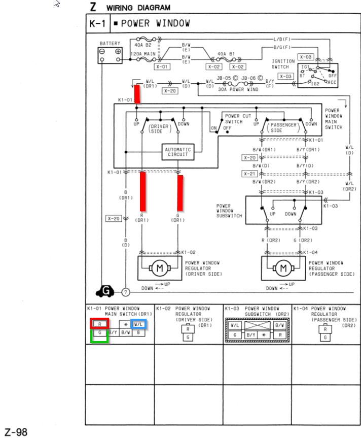 Still need to figure out why the driver's side main switch doesn't actuate the passenger side window but... one thing at a time. My Problem: Driver's side window was not going up or down. The passenger side window switch also does not work. Troubleshooting Resource: -Page Z-98 of the '94 Wiring Diagram, the W/L (white with blue stripe) wire is the switched 12V that supplies power to the window motor. R and G (red and green) wires go to the regulator and the motor. Steps: 1. Remove the switch assembly. In my case, my door panel hole for the side view mirror switch is "stripped" so I can pop out the side view mirror switch very easily. I then reached down through that hole and pushed up while prying the window switch carefully with a flat blade screwdriver. Even if you can't do this, it seems fairly easy to pry out the window switch without pushing up from below. 2. Connect a lead to the switch harness pin that would correspond to the W/L wire from the K1-01 "body" harness (blue box in picture below). Note that not all wire colors on the switch harness mirror what's on the body harness. Using a volt meter set on continuity check, when you put the other lead on the switch harness that corresponds to R (red box below) and you pull the switch to roll the window up, you should hear a tone. Move this lead to the other pin on the switch harness, G (green box below). When you push the switch to roll down the window, you should hear a tone. If you don't hear a tone, there is an issue with your switch and you can reference the other guides out there on disassembly and cleaning. 3. Check the "body" harness, K1-01. With electrics powered, the W/L pin should read 12 V and the B (black) pin below should always generate a tone when checking continuity to any metal on the body of the car (indicating ground). This was where my issue was, the W/L pin was reading 0 V. Turns out the W/L wire pin had come out of my X-20 connector (the one from the door into the interior of the car). This was a major pain to resolve. Unplugging the X-20 requires a sketchy amount of effort. I read you are supposed to pull the red tab (from the male connector outside the cabin) toward the door but I couldn't get it to move but a few milimeters, so I just pried and it came apart. 4. Check the regulator and motor. My way is not the best way but it worked for me. I knew that my motor was still good since it had been working before I disassembled my dash. I did not have a 12V power supply with enough juice to actually move the motor, but I spliced some random 12/5V power supply and hooked it up to the R and G pins on the K1-01 body harness plug. With the power supply plugged in, I could hear a faint click as the motor tried to move. That was enough for me to say that it wasn't the K1-02 (regulator) plug. Wiring Diagram, Page Z-98 https://cimg4.ibsrv.net/gimg/www.rx7...4e8649d9aa.png |