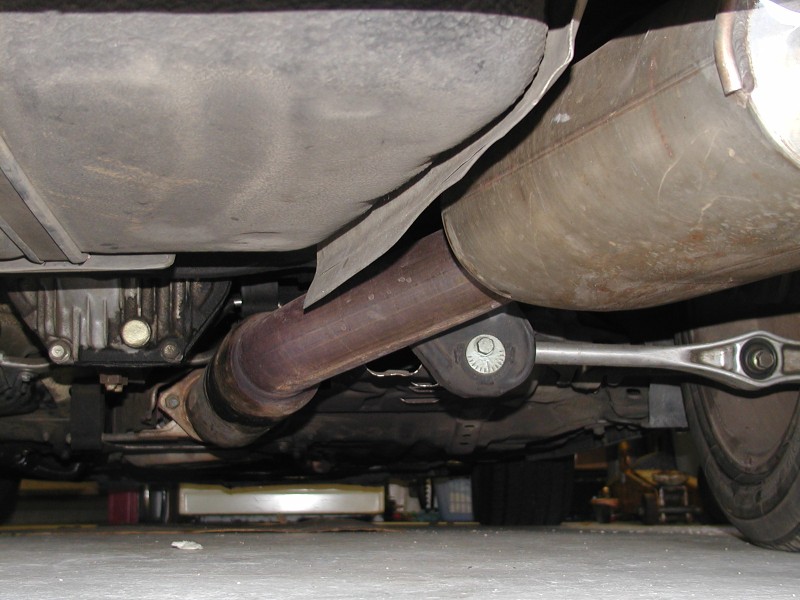 I recently welded a 3" ID, 4" OD Dynomax bullet muffler (WLK-24222 part number at Summit Racing) into my old 3" PF catback exhaust system between the stock cat and the rear PF muffler. The PF exhaust had been droning too much on the freeway and annoying me. The added muffler fit very well between the aluminum body cross brace and the diff.