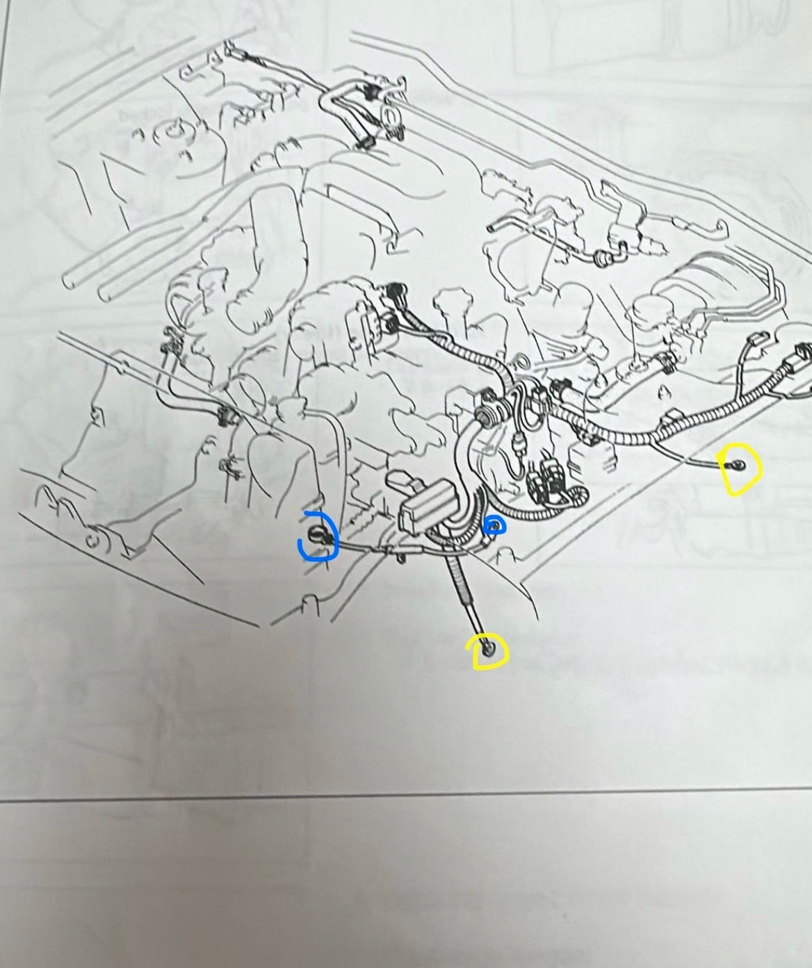 Top three illustrations show a grounding point for the emmissions harness from different angles. This is not like the grounding point for the coil harness.(although it must be close). Or maybe those grounding wires connect to the hold down nuts of the frame the coils sit on. Top illustration: View of coil harness and lead connections. My guess grounding is somewhere hidden in the left of the illustration, perhaps under the oil filler neck.