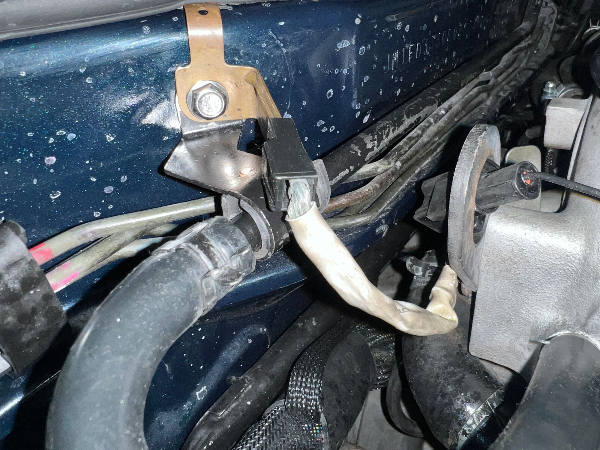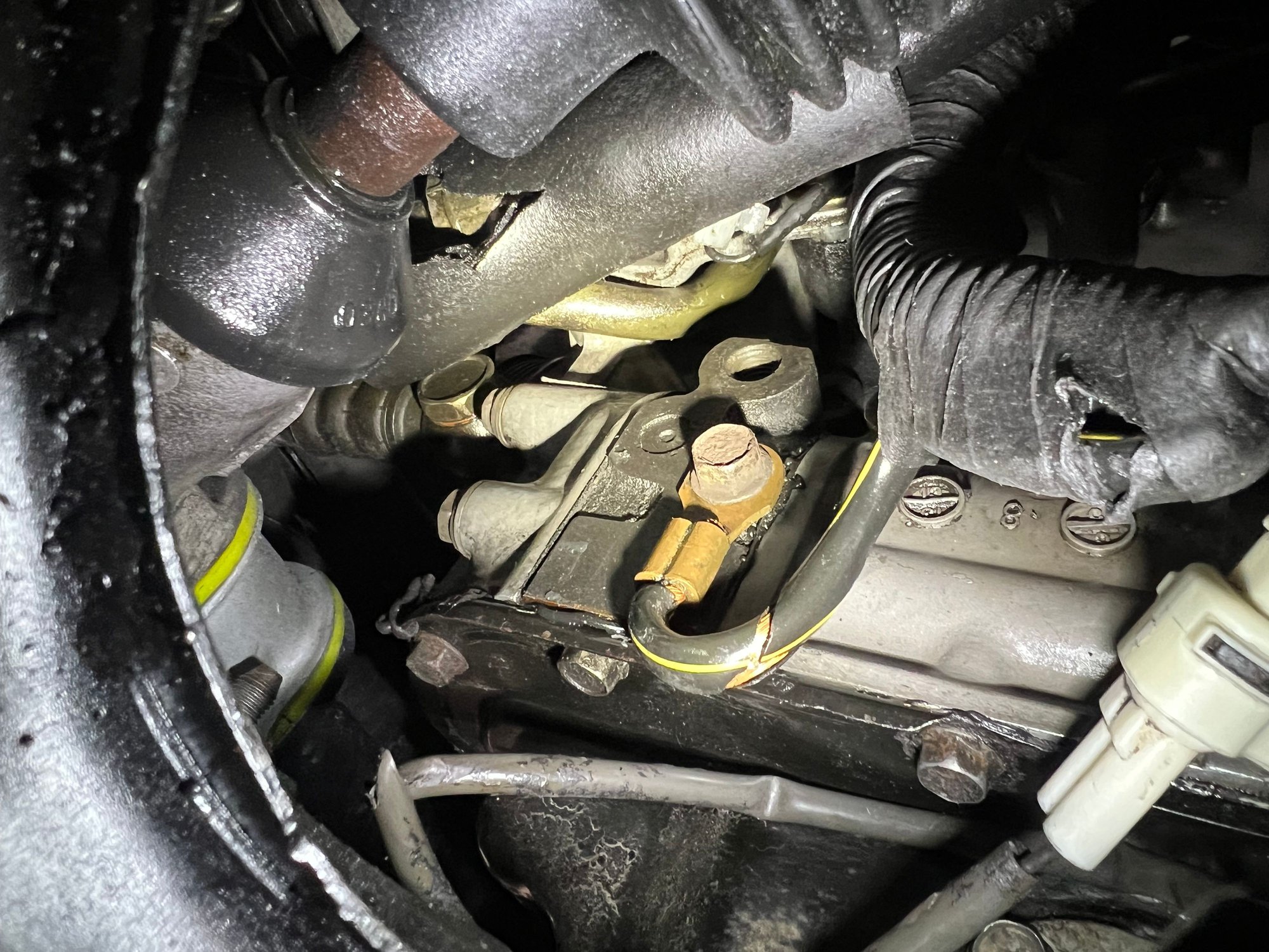 Regarding the ground connections on the upper manifold, one I think is connected underneath (it's anchored, but I haven't lifted the manifold to see where). The other ground connection is different from yours; I've attached a photo.