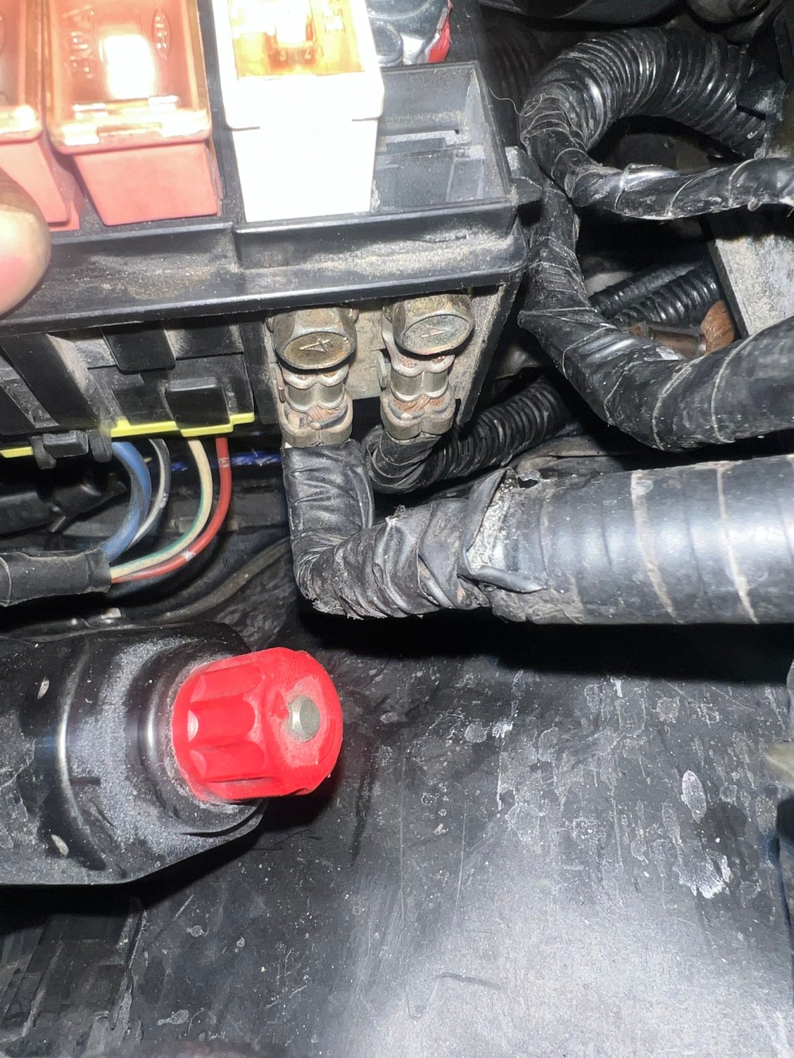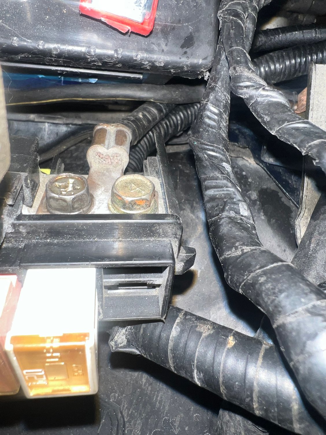 I've checked the ground connections according to the images you attached. From the positive terminal of the battery, I have three wires: two go to the charging harness, and one goes to the larger fuse box. Is that correct?