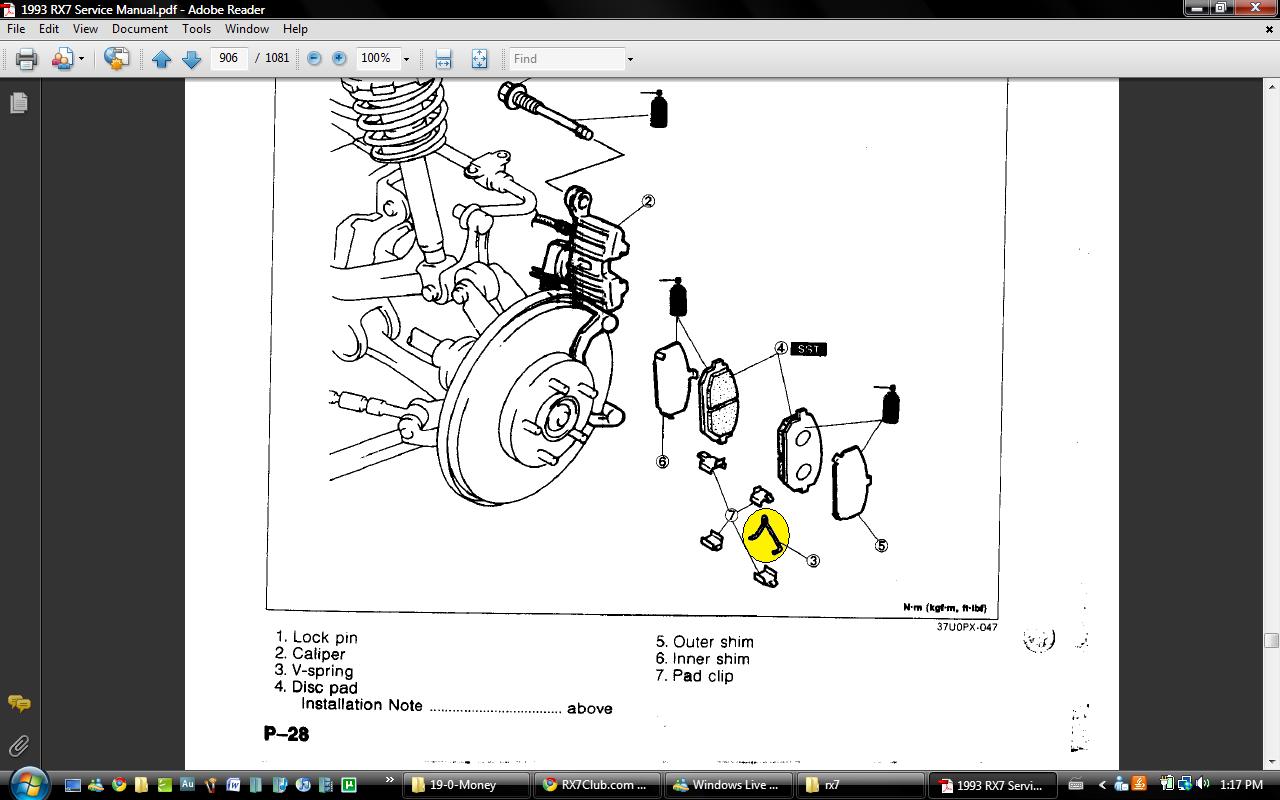 I'm changing the rotors and pads on my jdm fd, and noticed that the service manual indicates that there should be a spring present (see pic). I didn't notice any such spring when taking them apart (was very careful, and looked for it).