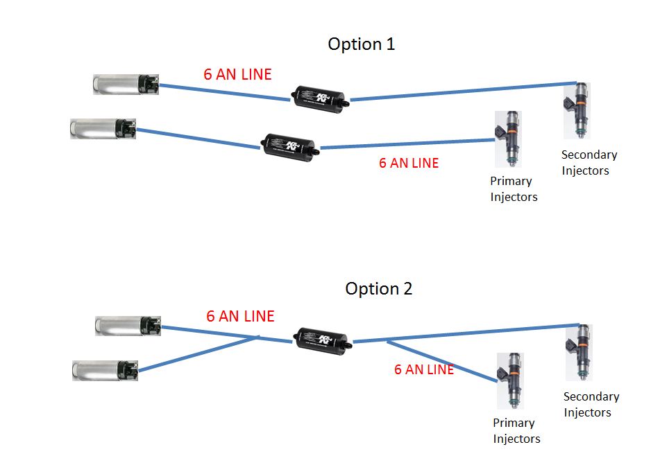 hey all, just want to see your opinion on which option i should go with and why... see picture and let me know what you guys think... i currently have Dual Denso pump, one pump go directly to primary and the other pump go to the secondary with -6AN lines... i'm thinking of doing Option 2 just in case 1 pump goes out the other still pumping... thanks guys