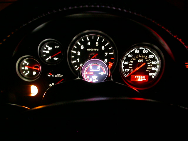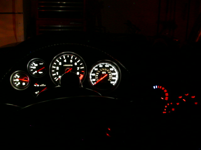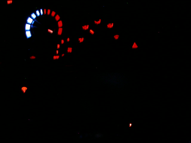 I like the way the gauge mod looks now. Everything is almost perfectly even in lighting. I realize now that the only way to brighten the spot on top of the tach is to add another bulb. No brighter bulb will help out the area since the bulbs are farther away.