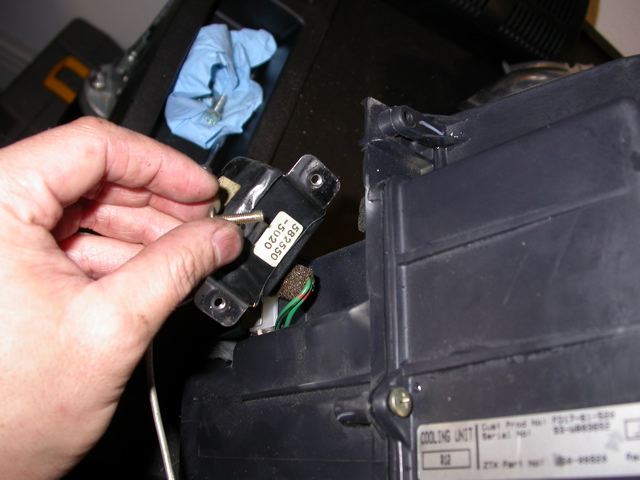 Step 9. Open the evaporator by removing the screws and two spring clips. The evaporator is encased in styrofoam. One you get it out you should see the evaporator and expansion valve.