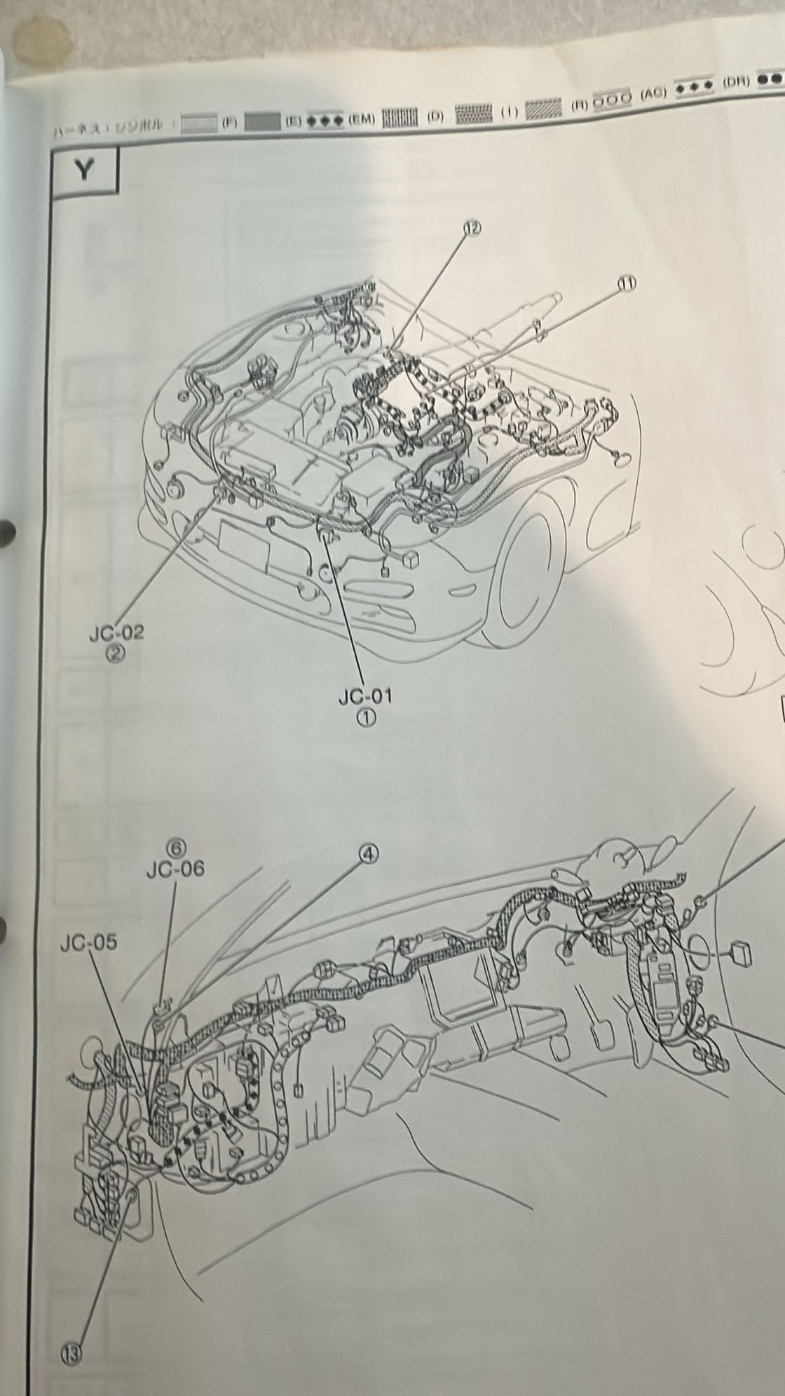 This is from the Version 1 wiring diagrams. It shows the harness but good luck following the diagram. There is not a single schematic that shows all the wires and connectors in one diagram. Note that in earlier JDM and USDM manuals the "engine" harness is called the Emissions Harness and the starter circuit harness is called the Engine Harness. This is changed to Engine harness (1) and Engine Harness (2) in later JDM manuuals.