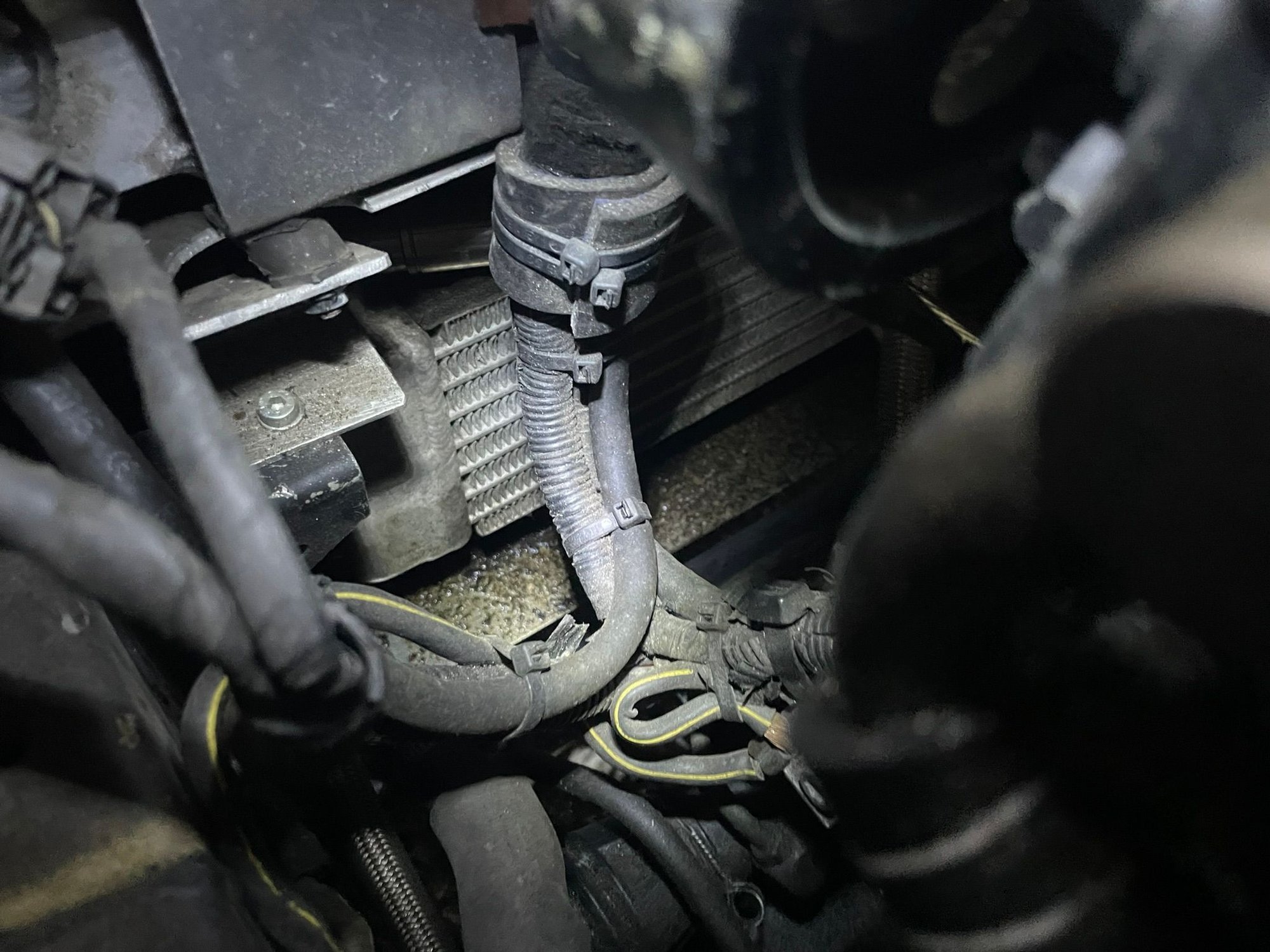 Oil leakage under the car (engine) but it seemed to be clear two stroke oil on the floor, probably coming from the hose of the extra oil tank. Everything below the engine was covered in this oily grease, as seen here but the engine was rather dry.
