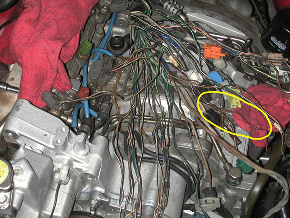On the back of the thermostat housing there are 2 plugs. The one on the top is green. That's the water temp sensor for the ECU. The one directly under it (Single prong connector) is the fan thermoswitch. It's a black plug. Check and see if it's still there. It may have broken while you were pulling the harness and could still be there. The plug wire usually breaks VERY close to the plastic, making it hard to solder back on.. You can shave the plastic down with a dremel and solder it.