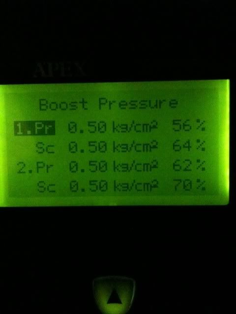 Also, you turned off your overboost fuel cut. I'm having trouble getting through to people on this... fuel cut saves motors. There's a reason why almost every turbo engine has programmed in from the factory. Set your boost levels (Pri and Sc values) to about .50 kg/cm^2 and you should hit fuel cut around 11-12psi