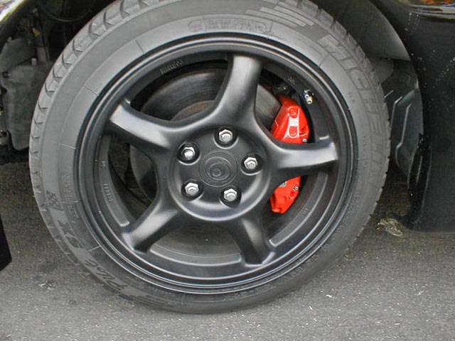 While I had my calipers torn down for a rebuild, I sent them out to be power coated. This finish holds up very well to the heat and brake dust. Also polished the Mazda, iIf you are not proud of the car Mazda made then sell the car. Those of us in competion can't just change out the brakes and besides, stock brake calipers with good pads, fluid and cooling can hold up to a lot ...