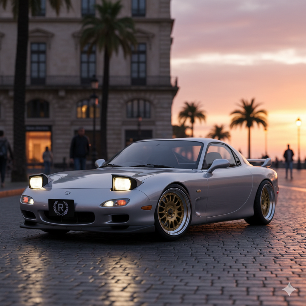 Used prompt "A photorealistic image of a silver Mazda RX-7 FD3S parked on a city street, featuring staggered gold BBS LM wheels and a shallow depth of field."