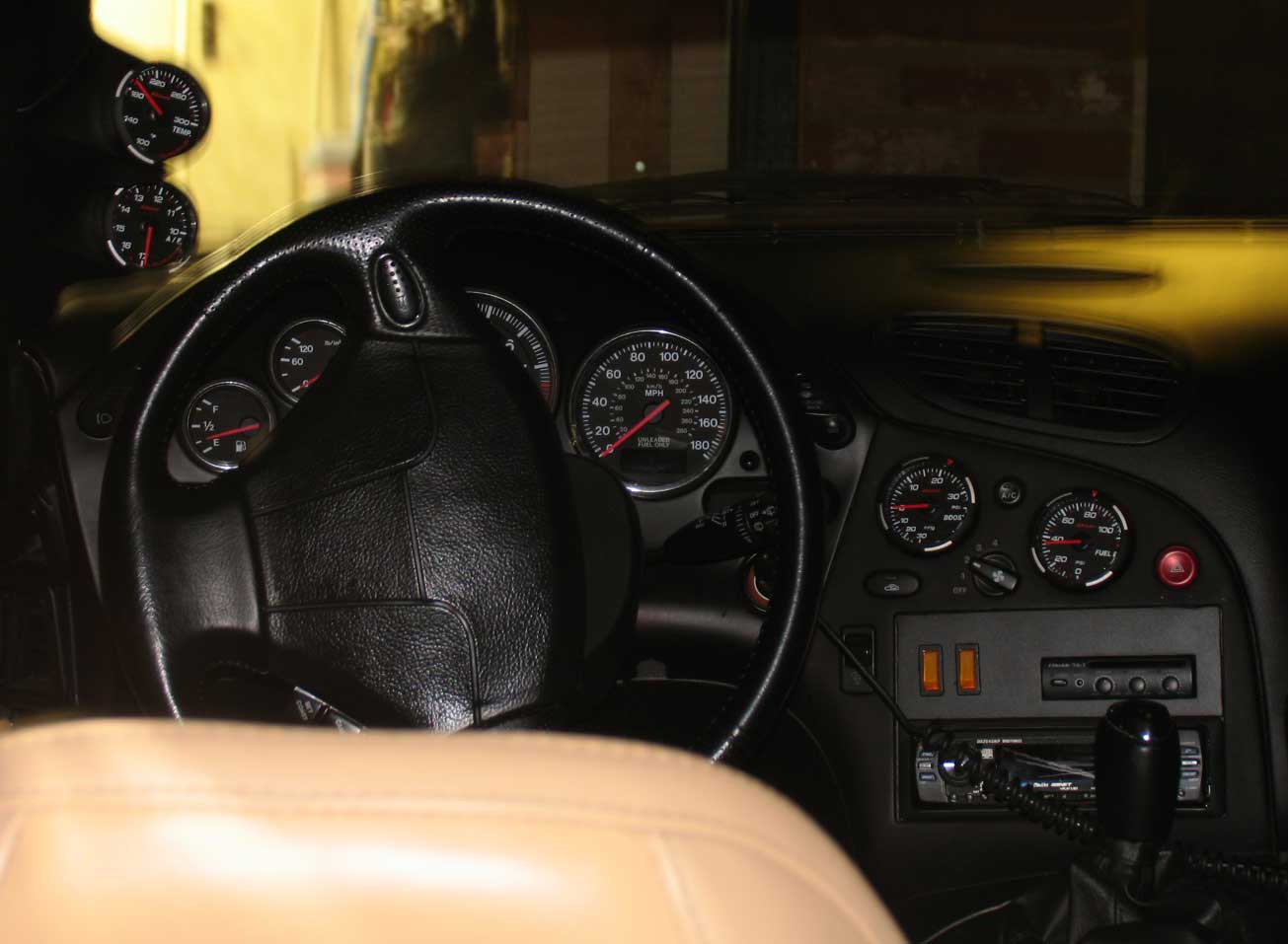 The gauges are Autometer boost on the a-pillar, and water temp/oil pressure/air fuel on the dash. The PFC Commander is also lying by the shifter, as I still need a damn mount for it.