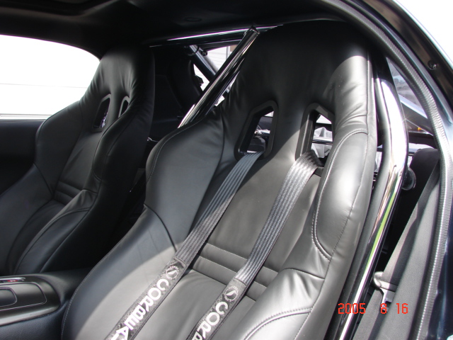 The leather was an option from Corbeau. The stearing wheel is a Nardi D cut. The roll bar is a Kirk racing bar that I had chromed. I will try to get a few more intrior pics.