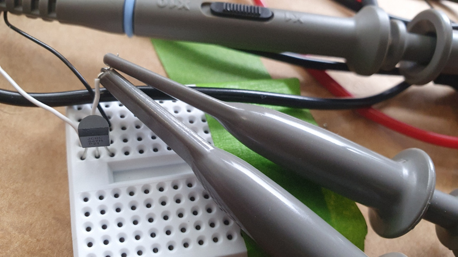 At this point it you should also hook your CRO up to the collector to confirm the signal going to the tach. My set-up below. Why do I always end up with a bench looking like this?: