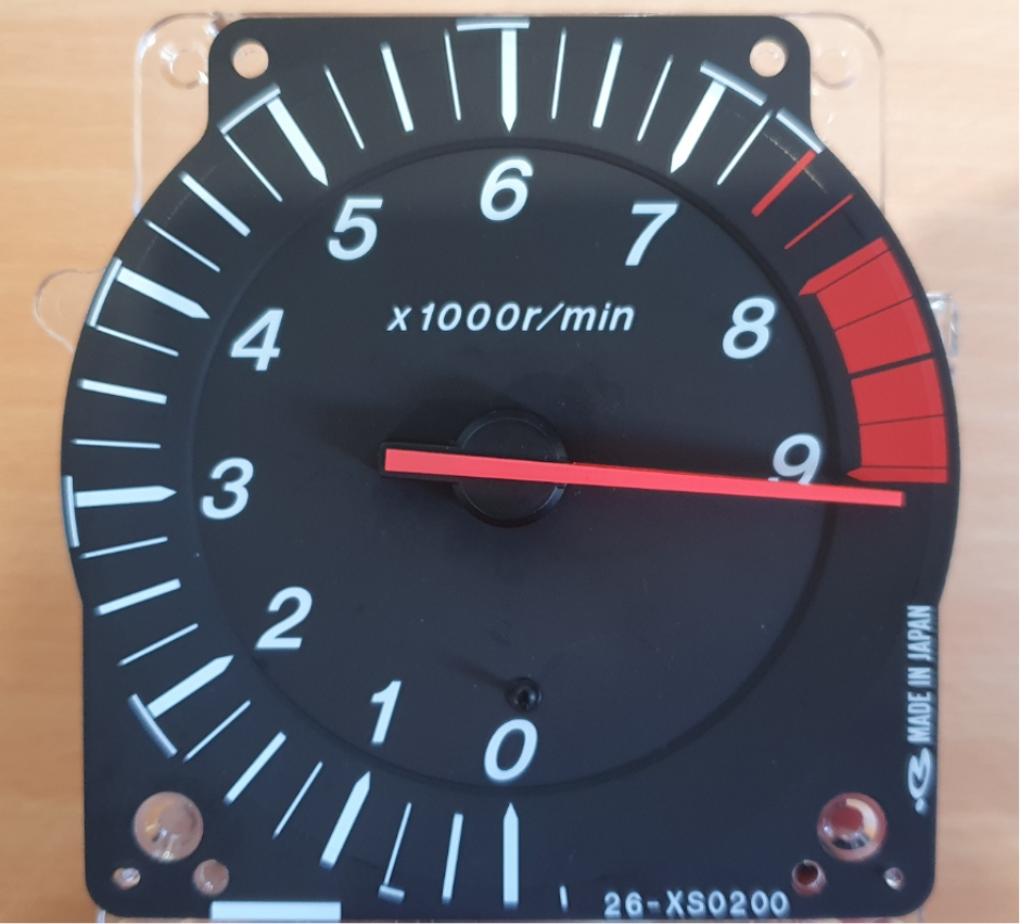 Adjust for the idle error with the tacho powered down. Swing the needle around to 9,000 rpm. Note the needle position at the stop just past 9,000 rpm. Remove the needle and replace it firmly, but not fully, back around 8500 rpm then rotate the needle against the stop to the point where it cancels the 750 rpm error. You can only position one way. If you go too far you must restart the process.