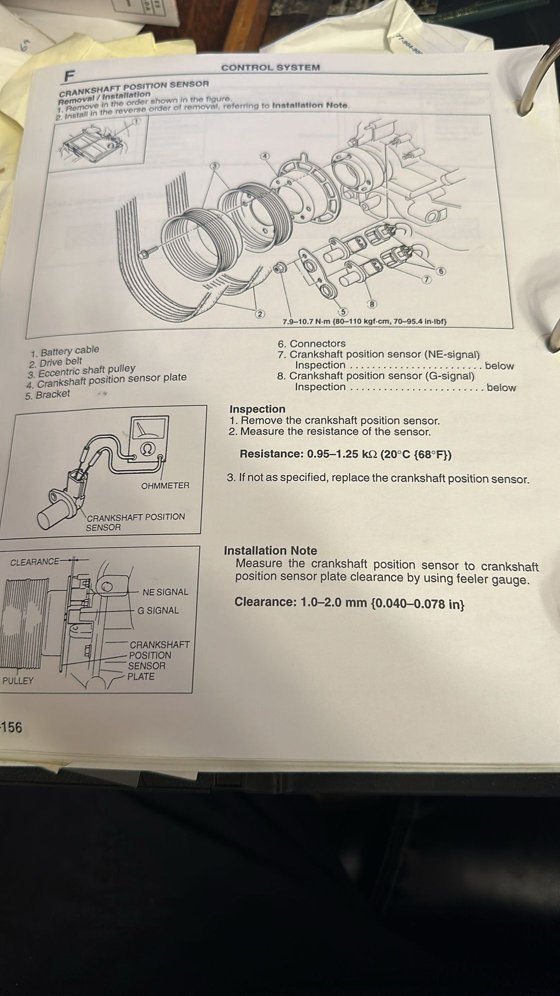 Appreciate all the sending over on this with photos and explanations...yeah FSM doesn't give any guidance if it is out of spec. Pulleys have never been touched during my ownership period and I have never had any issues starting or running bad one bit until this little endeavor I have put myself in. This makes me not really want to touch anything with the plate or CAS sensors yet. Save that for last if all else fails.