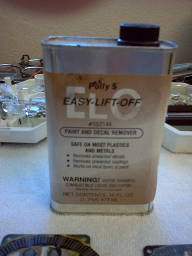 I'm not sure what the active ingredient is in the ELO but it is made for safely removing paint from model trains. I first heard about it on here. I think it was in a thread about removing the plastic film on the stock interior panels that always peel. It worked awesome for taking the peeling film off without melting the plastic panel so I figured I'd try it for this application.