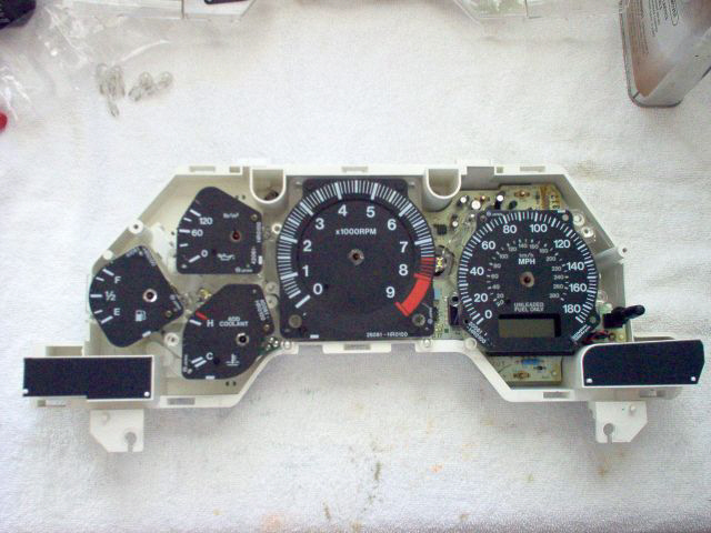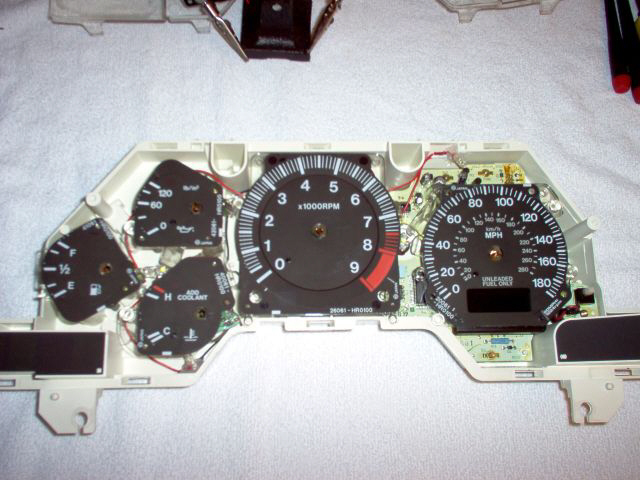 I also want to add that my tach needle does not read correctly after I replaced it. I don't know if I put it back in the wrong place or bent the spring inside but it is off by about 500rpm. I'm not sure how acurate the other gauges are but they are all very close as far as I can tell. If some one has a better way of taking off the needles, please let us know. I again want to stress that you are doing this mod at your own risk.