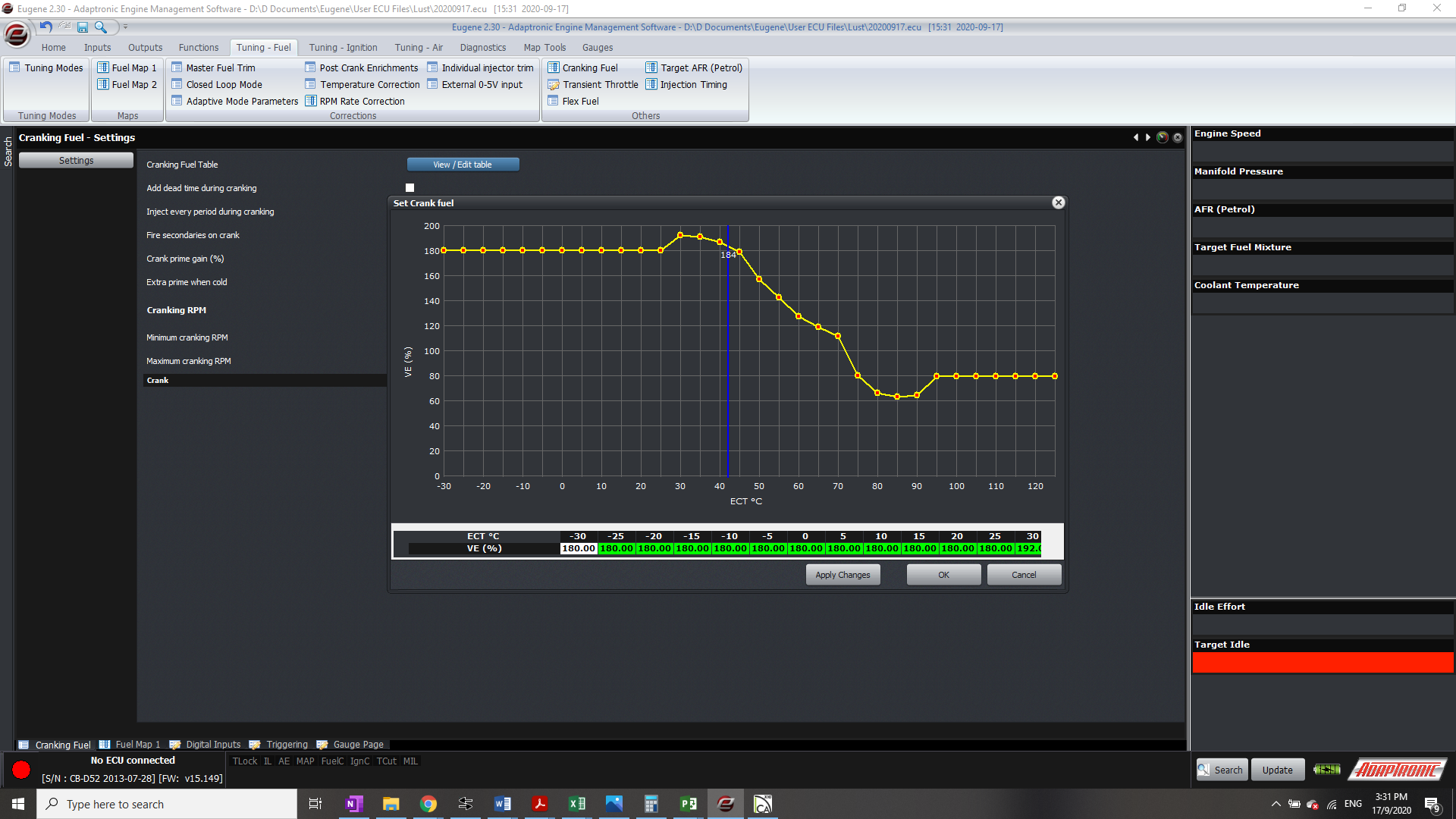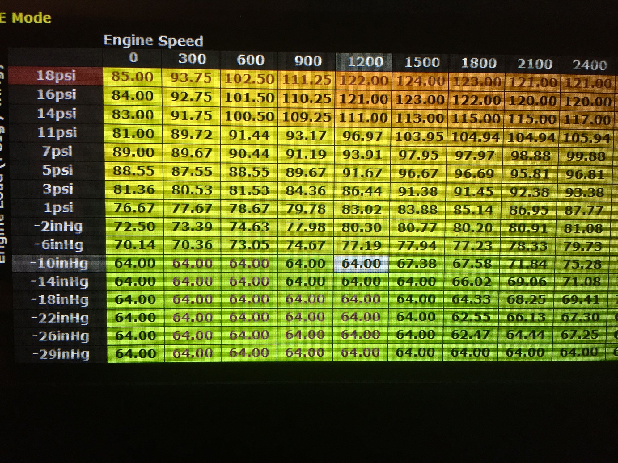 Can you post a picture of your cranking map for reference. Reason I ask is I am confused on the #'s you guys are talking about. I am pretty sure my #'s are like 14 at the cold temp end and tapers down to like 8 on the high temp end. or something like that. I am not sure that is making sense. Maybe I am misinterpreting something. I took a quick look at mine when I saw this post, but not sure I looked in the all the right areas. Or maybe post your map and I can take a look at it that way as well. I would love to maybe take a class on Eugene and have some one walk through screens and explain things a little.