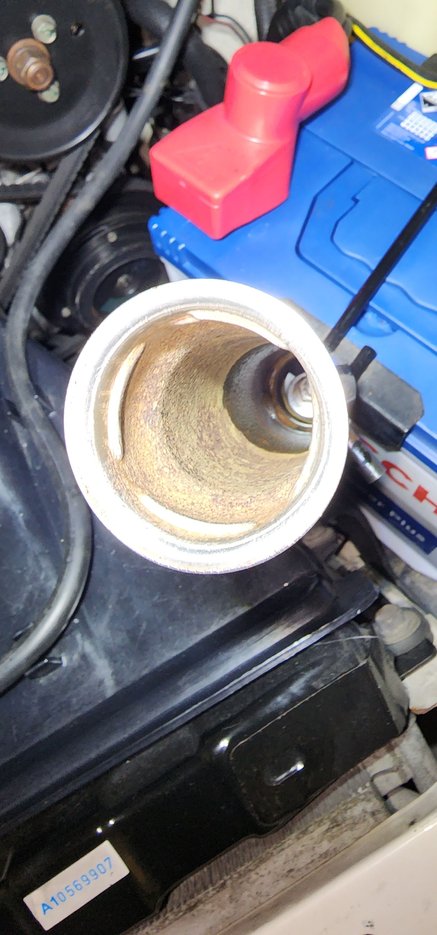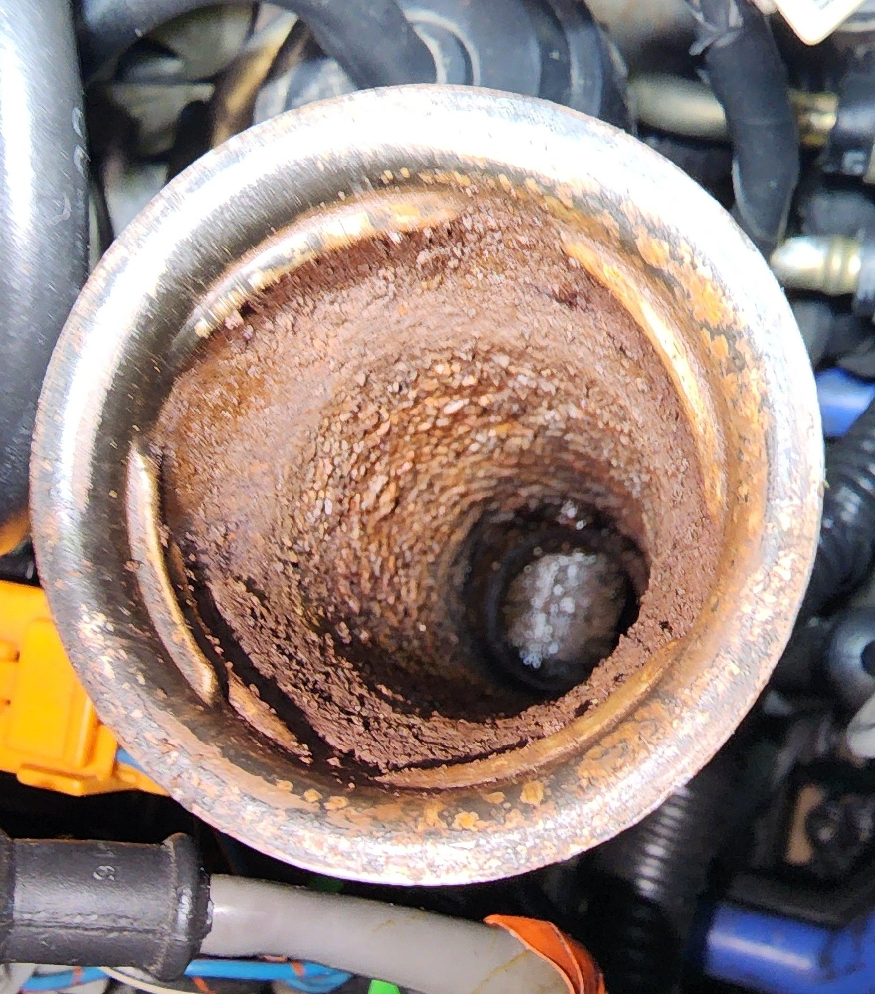 No idea, looks like sludge you'd find in an old cast iron holden donk with cupro radiator - does seem extraordinarily thick in that last pic to just be emulsion condensate corrosion even if it did sit for that length of time! You can very gingerly tap out all the pressed metal oil and water barbs using a hammer with a dolly on the other side of the fitting. Stopping the crud falling down might be a trick, as the tapping will dislodge it most likely......paper towel manoeuvred carefully down the hole beforehand.....or drop the sump?