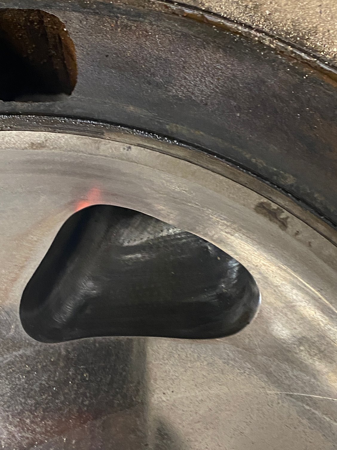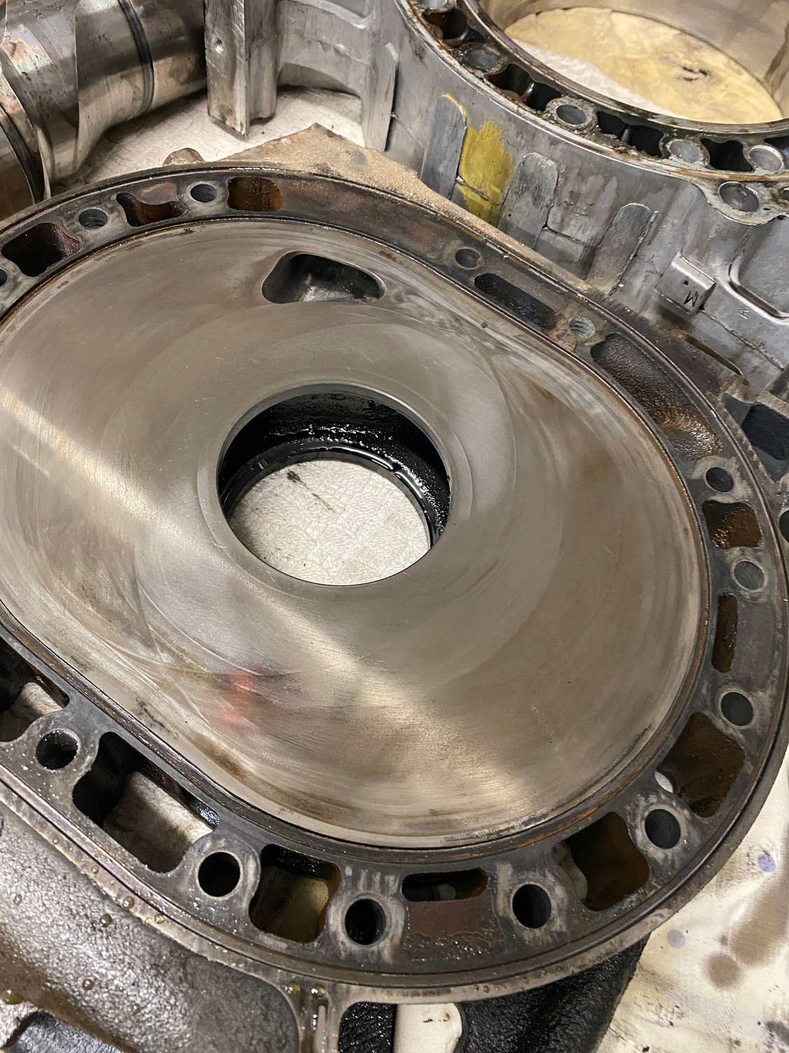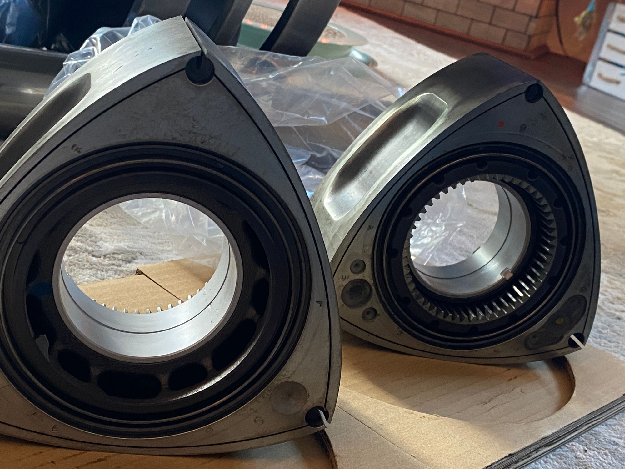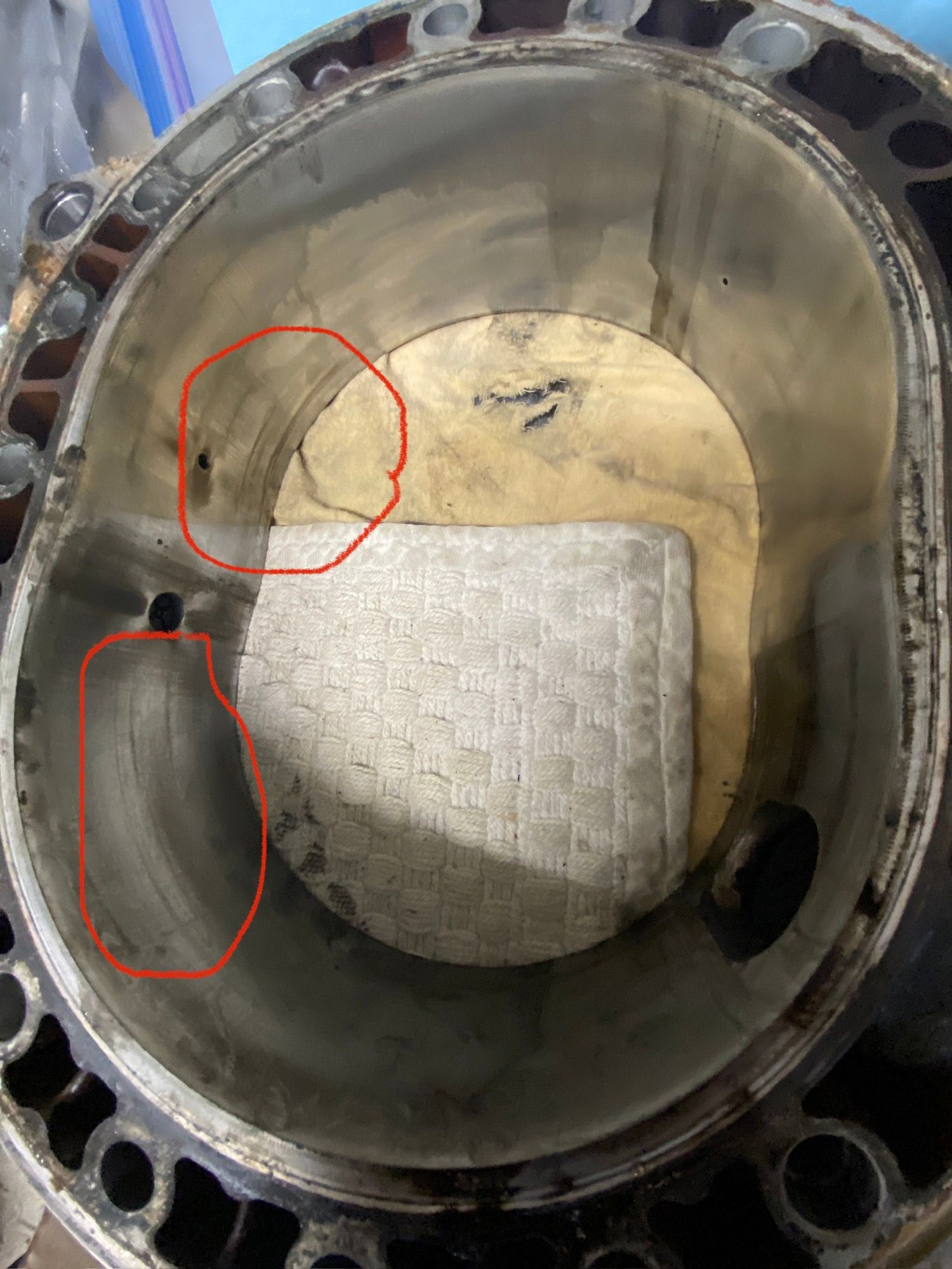 First time pulling a 13B. Surprised how easy it went After accepting that the compression wasn’t going to magically reappear, the decision was made to get at it and pull the stinker out Initial thoughts: crusty af Ordered an NPT- barbed fitting and jp3 rear bleeder to remedy this rear coolant nipple.. this would turn out to be a recurring issue with various coolant passages Should have spent the money on a flywheel stopper (or an impact) I did buy an impact after doing this lol Irons were all in fantastic shape. Barely any step wear to comment on I thought this was a stock port at first but the guys at Atkins informed me that was not the case Rear housing was toast. Picture isn’t great but there’s deep scoring from the broken apex seal The culprit