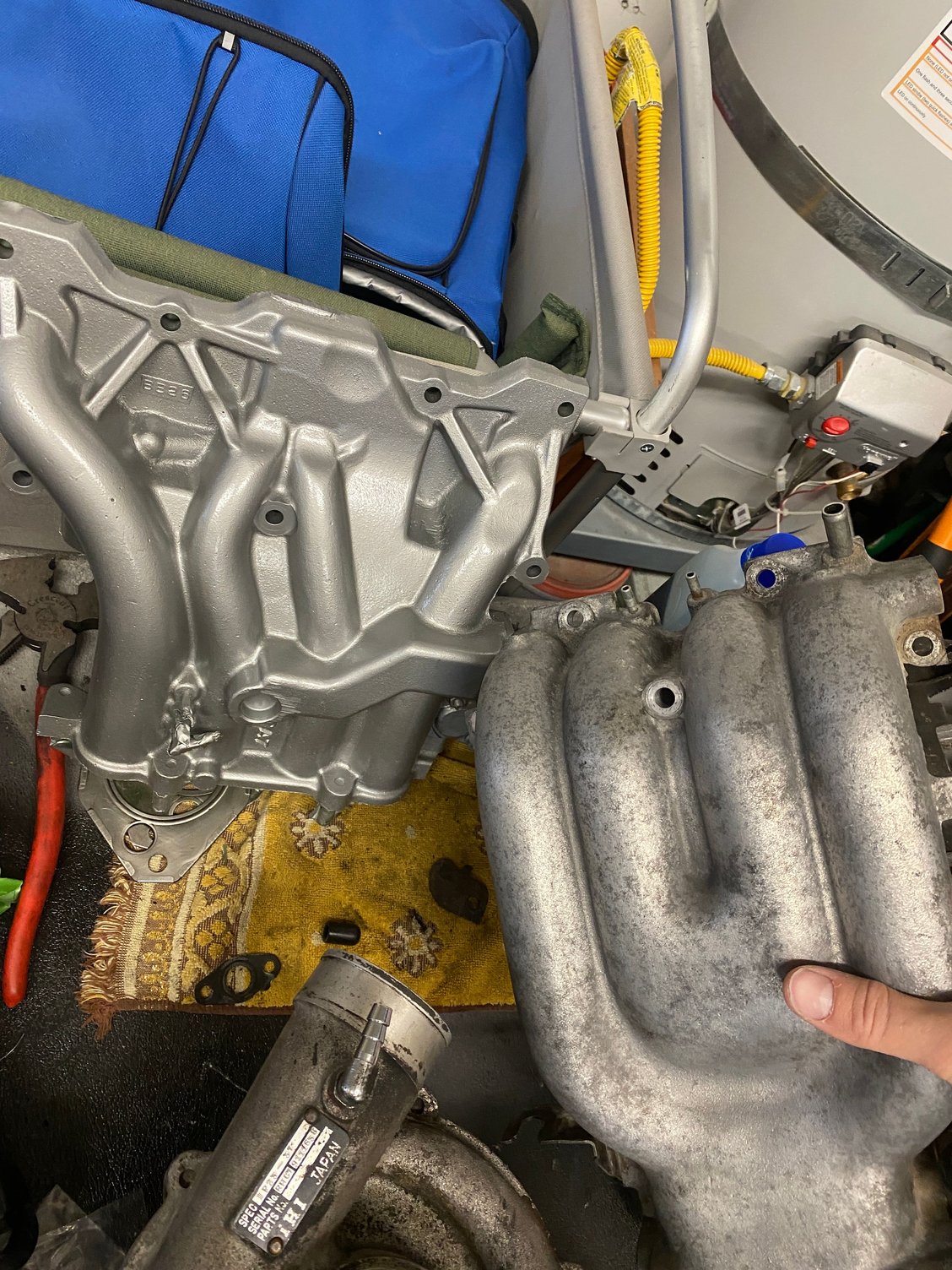 Wanted to do vapor honing but impatience and financial reasons led me to paint the aluminum bits, i think they turned out great but we’ll see how they hold up to temps (I did use engine “ceramic” paint at least) Little mock up to motivate myself Probably going to put some heat tape on the LIM at least or get a shield Had a nice view while painting (my first car that made me want to take another crack at rotaries)