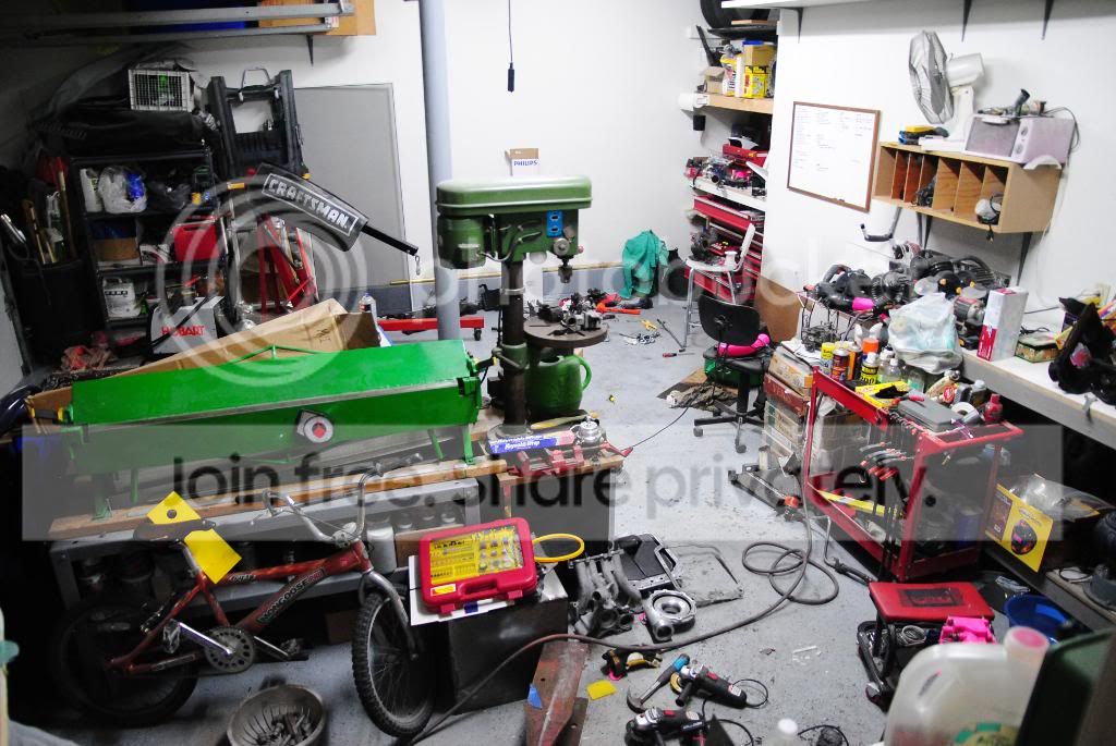 overall pic of the garage. what a mess. i keep flip flopping between projects...