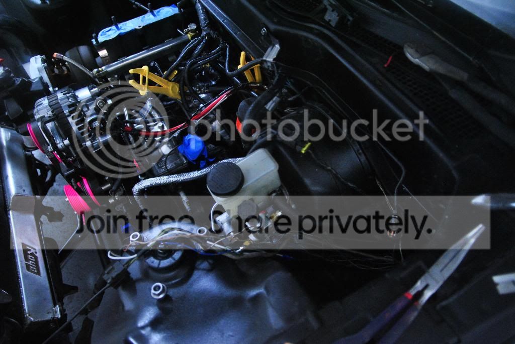 wiring, routed the alt wire along the firewall and under the UIM. also the ignition wires/oil level/coolant buzzer etc will be ran under the brake booster