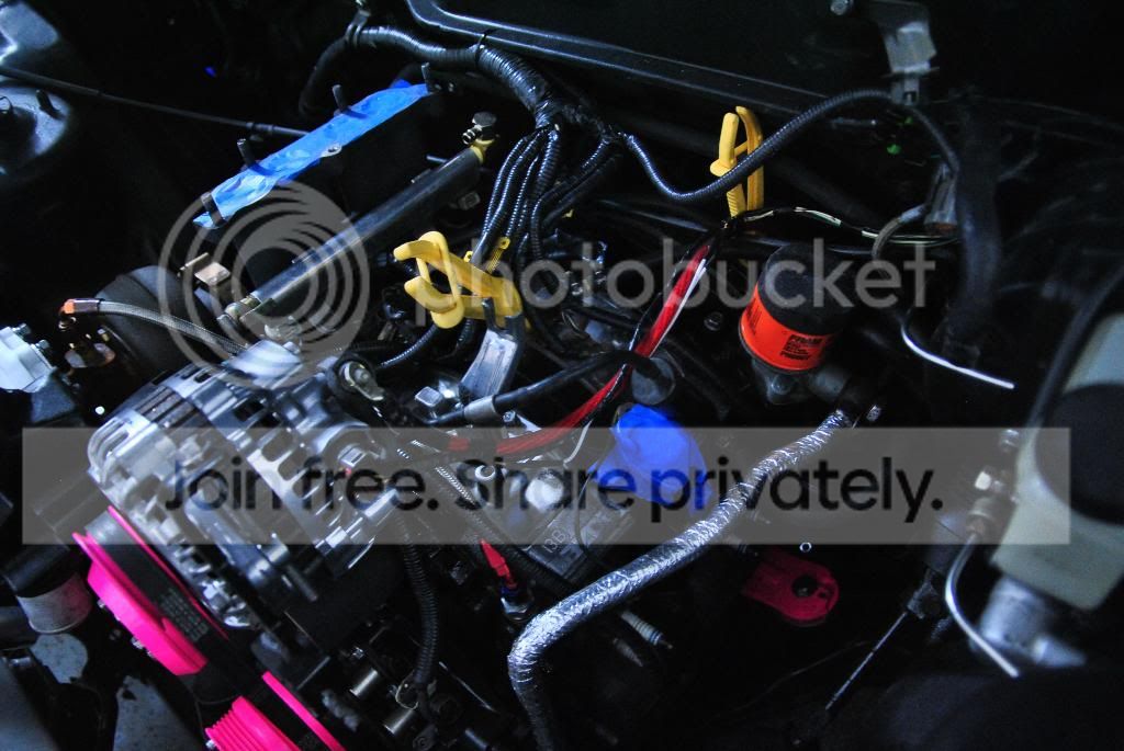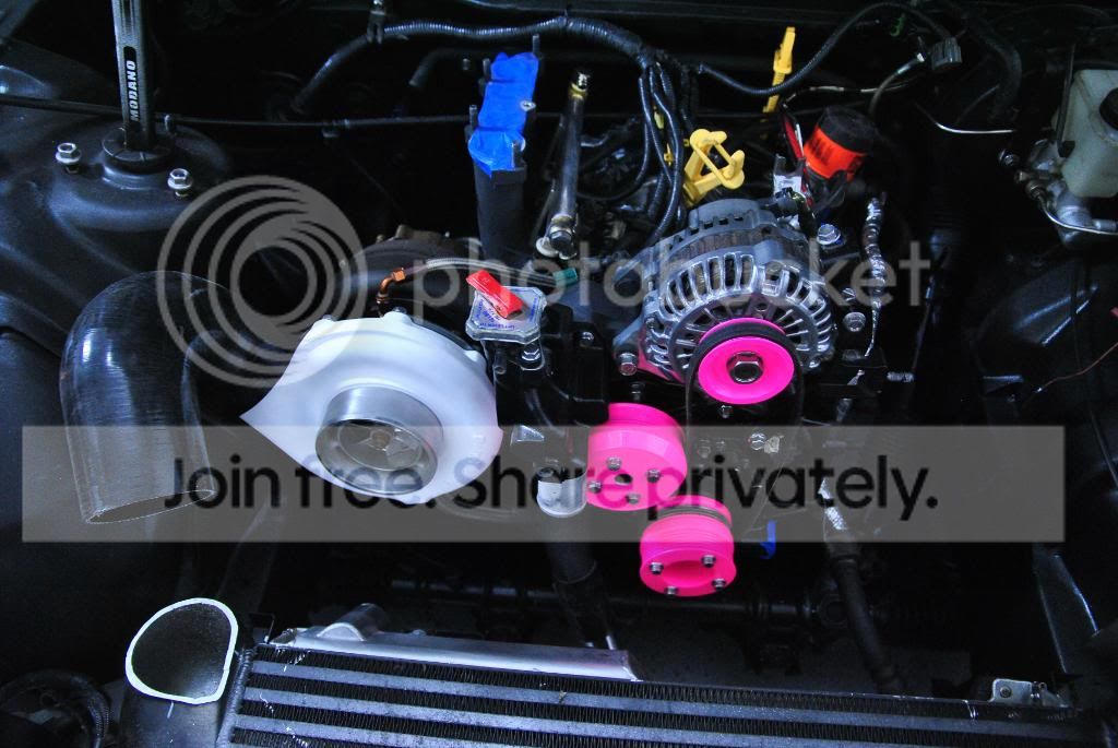 As far as the pink, it pops really well against the black bay. I personally think it would look amazing if you powder coated the compressor housing pink again. Then paint the intercooler end tanks, pipes and TB pink. Water filler neck, alternator and pulleys black. Then when you look in the engine bay the pink corresponds to path the air takes feeding into the engine. Just my 2 cents, either way keep up the good work and progress.