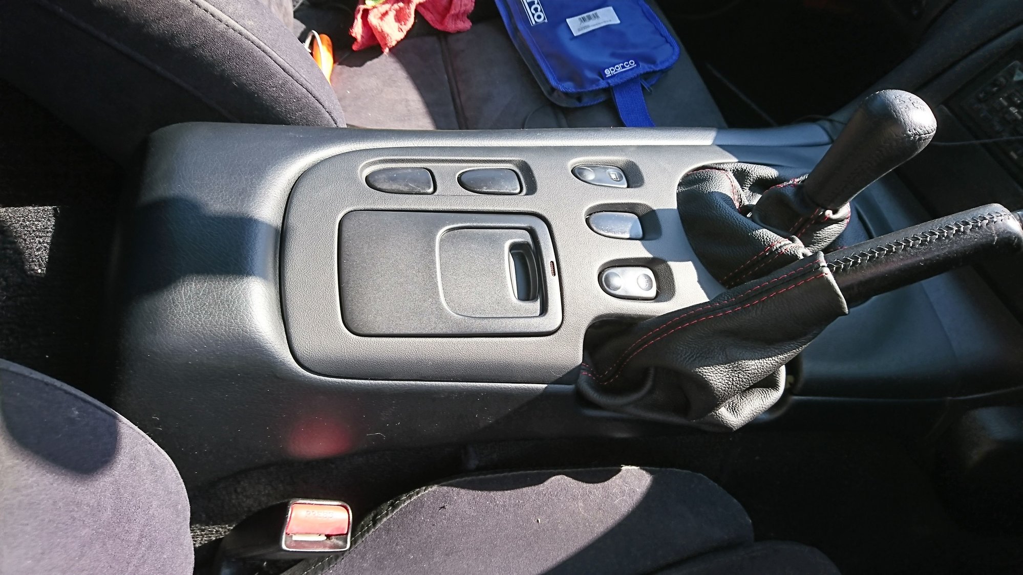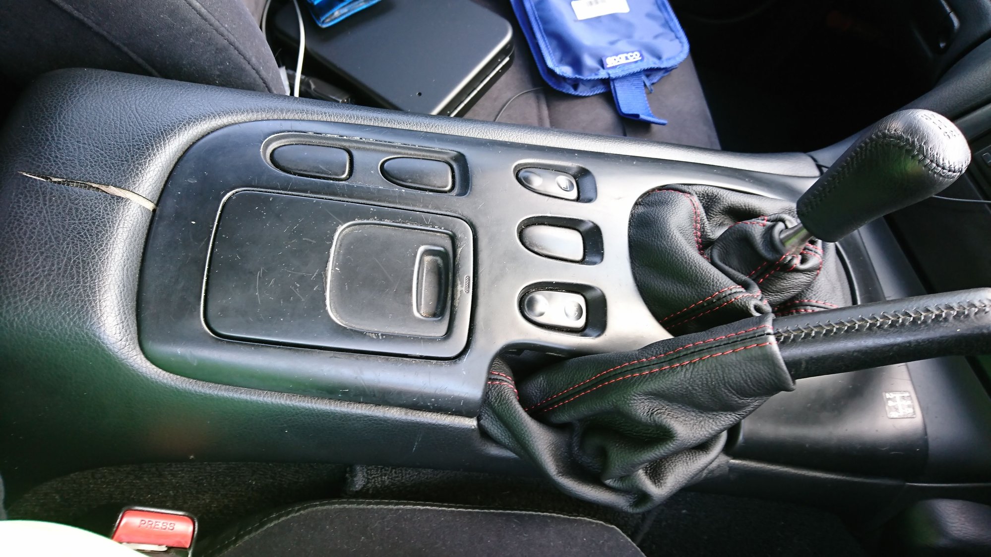 As you can see, the door panels had some weird glue stuck to them, the side pocket was broken of course, and the center console was a mess. I gave up on getting the glue off cleanly and bought used door panels, along with a new side pocket, center console, and other accessories. Eventually I had to get new dummy buttons for the center console because the old ones stood out too much. The car also got a new OEM shift **** and a new leather bids courtesy of Redline. Their product is as good as it was last time.