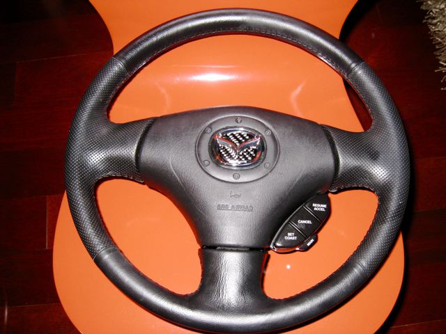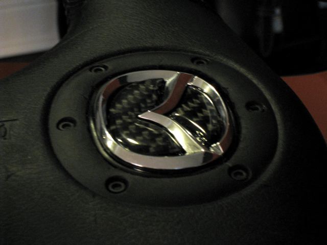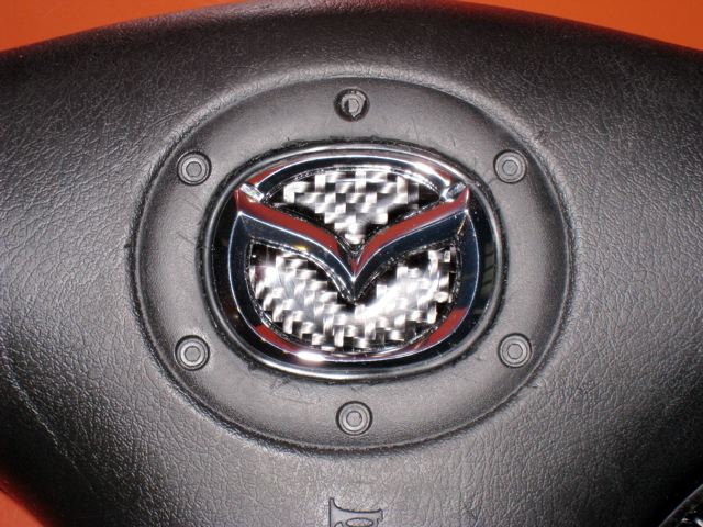 The one part on the FD I don't like is the clunky 80s looking steering wheel so I sourced a Miata wheel with cruise control off of eBay and bought the airbag from a Miata forum. The airbag's flying m emblem had a scratch on it. It looked cheap anyway so I decided to use a 3D chrome emblem from a Miata (same size as the flat original sticker) and retrofitted it into the wheel. Also use a carbon fiber insert on the emblem. Turned out pretty cool and should be a nice addition to the car. The scratches on the airbag cover were caused by me using (poorly) an x-acto knife and if I were to do this again, I would know how to do it without any scratches. The flash makes them look much more prominent than they really are and you don't notice them at all in daylight so I'll be good to go. FYI - my total cost for the project was $140. Compare this to the $400 - $800 you'll pay to buy one of the RX7 wheels like mine and you still don't get cruise control